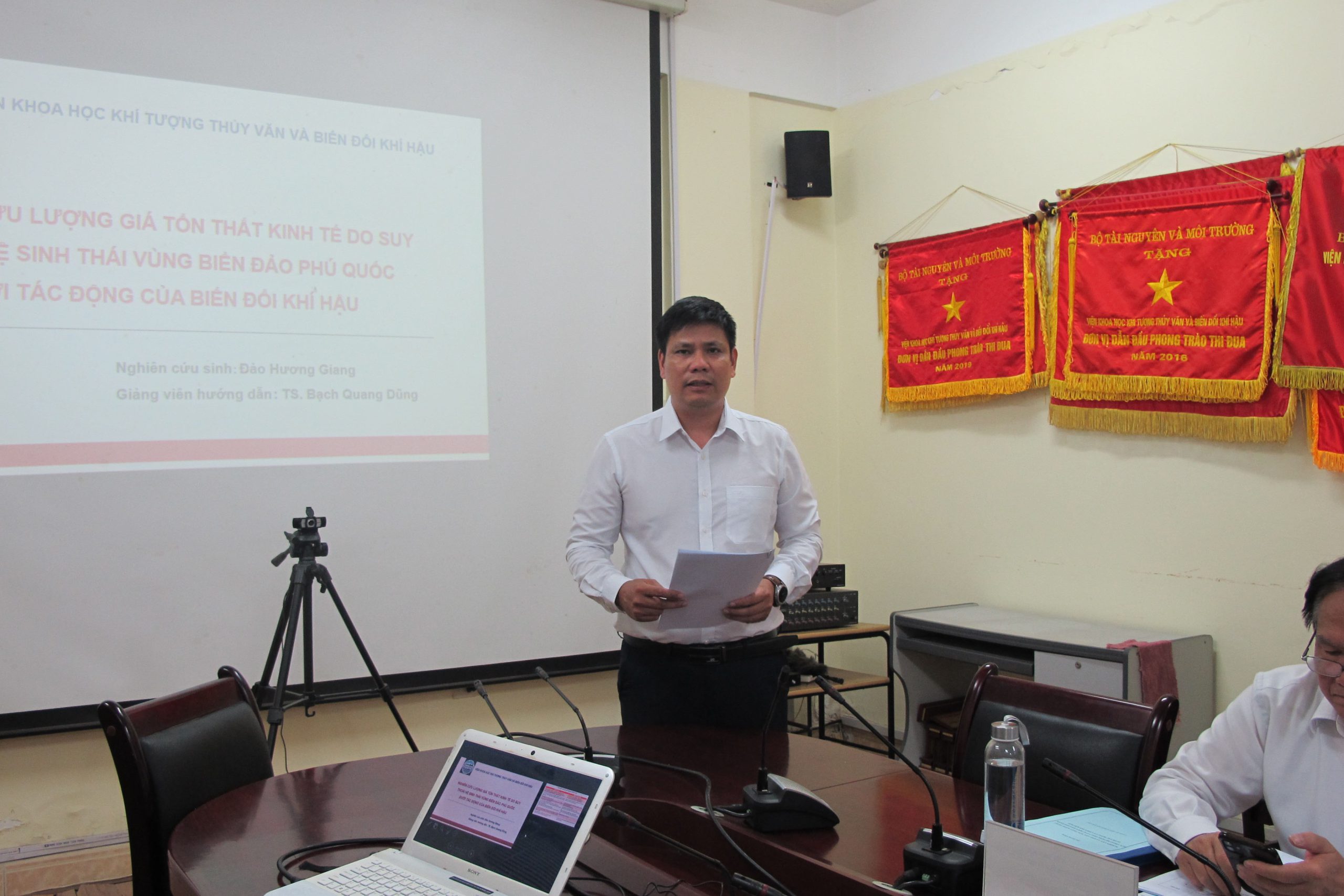 Tại buổi đánh giá, các thành viên trong Hội đồng đã nghe NCS. Đào Hương Giang trình bày tóm tắt các nội dung của luận án. Trong đó, mục tiêu của luận án là đánh giá được tổn thất kinh tế của hệ sinh thái vùng biển đảo Phú Quốc do biến đổi khí hậu dựa trên cơ sở lý luận và thực tiễn, từ đó đưa ra các giải pháp nhằm giảm tổn thất kinh tế tại khu vực này có nguyên nhân từ biến đổi khí hậu.