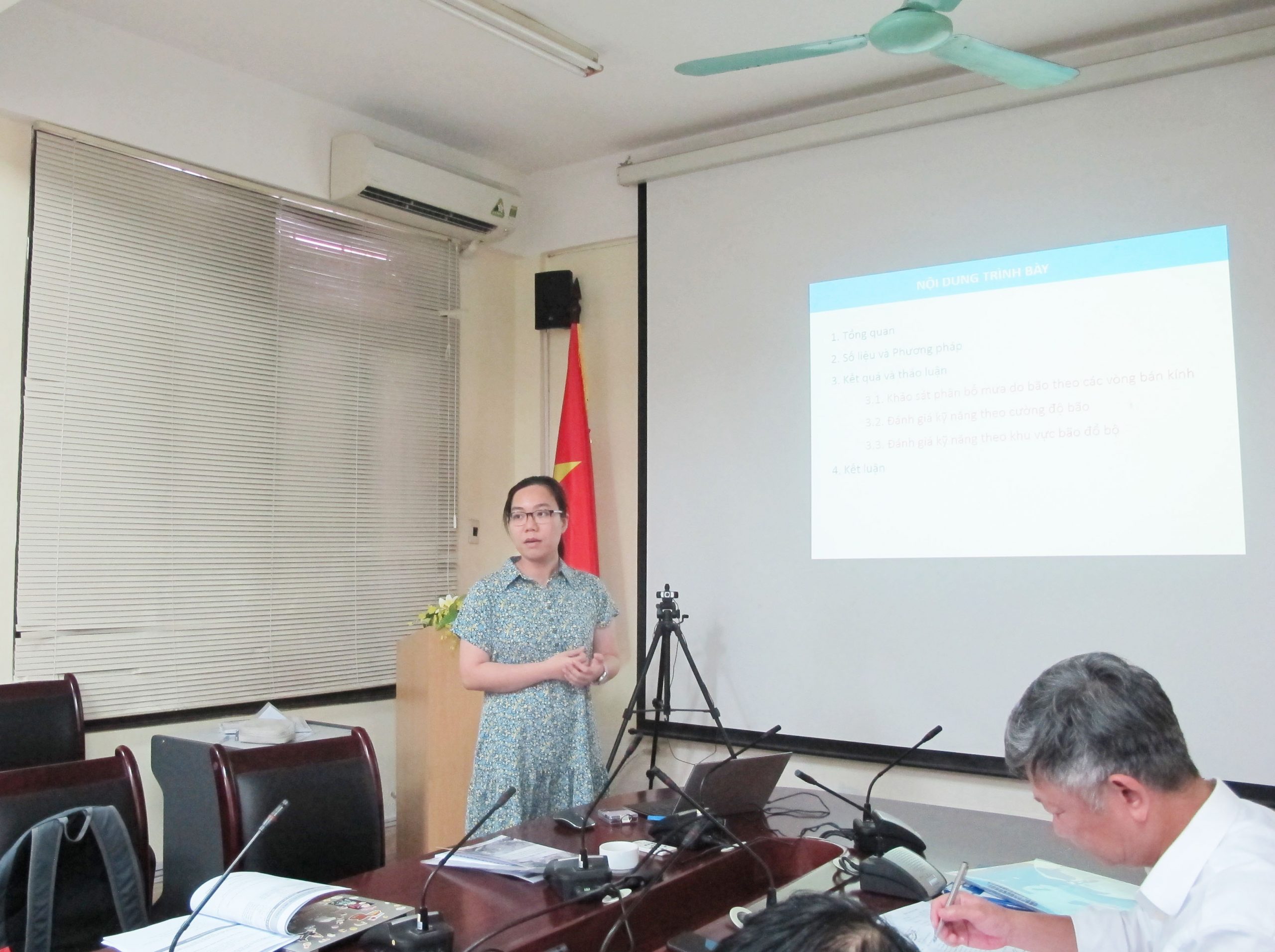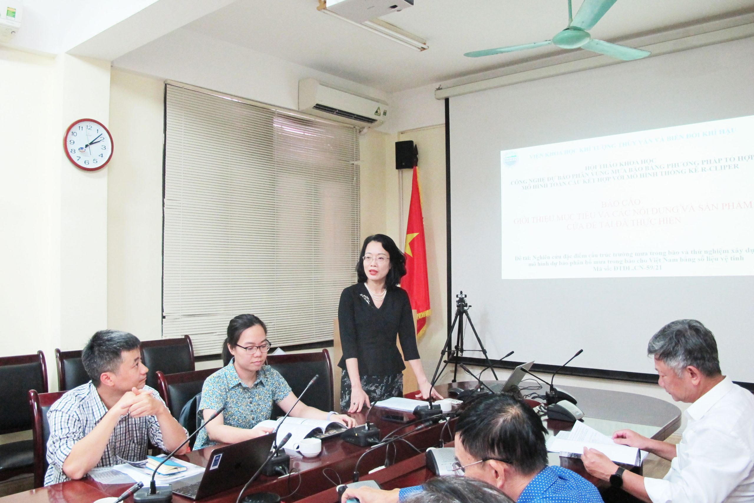 Đại diện nhóm thực hiện, PGS.TS. Phạm Thị Thanh Ngà đã trình bày báo cáo giới thiệu mục tiêu và các nội dung và sản phẩm của đề tài. Theo đó, đề tài tập trung vào hai mục tiêu chính là xác định được đặc điểm cấu trúc ba chiều trường mưa trong bão và đặc điểm phân bố mưa trên đất liền do bão cho khu vực Việt Nam bằng các nguồn số liệu mưa vệ tinh TRMM và GPM/DPR. Đánh giá được khả năng dự báo phân bố mưa do bão trên phần đất liền Việt Nam bằng phương pháp thống kê và nhận dạng tương tự.