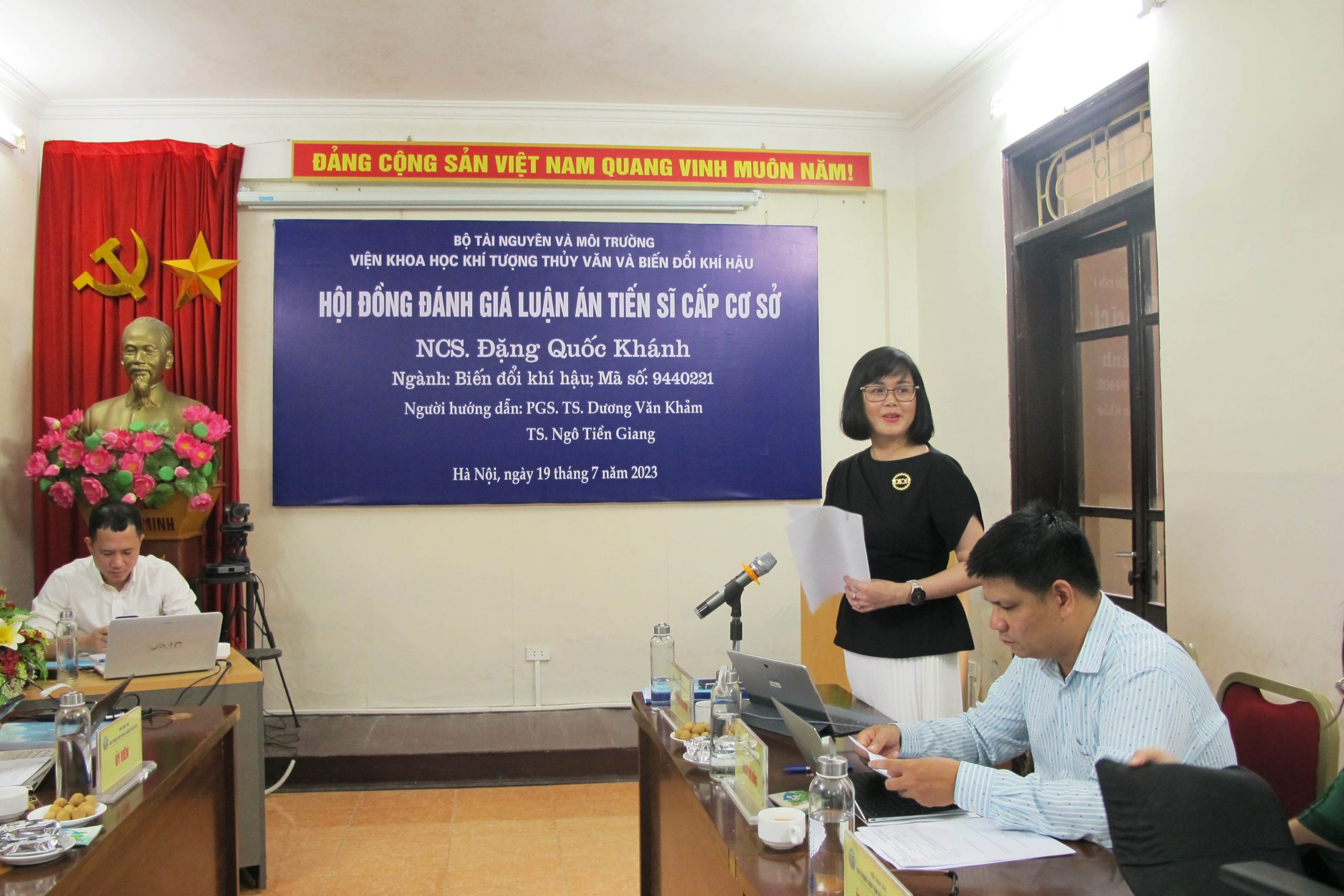 Tại buổi đánh giá, TS. Trần Thanh Thủy (Trưởng phòng Khoa học, Đào tạo và Hợp tác quốc tế) đã tuyên bố lý do, giới thiệu đại biểu và công bố quyết định thành lập Hội đồng đánh giá luận án tiến sĩ cấp Cơ sở của nghiên cứu sinh NCS. Đặng Quốc Khánh gồm 7 thành viên: GS. TS. Huỳnh Thị Lan Hương (Trường Đại học Tài nguyên và Môi trường Hà Nội) là Chủ tịch Hội đồng; TS. Đặng Quang Thịnh (Viện KTTVBĐKH) là Ủy viên Thư ký; PGS. TS. Vũ Hoàng Hoa (Trường Đại học Thủy lợi) là Ủy viên Phản biện 1; PGS. TS. Nguyễn Thế Hưng (Trường Đại học Tài nguyên và Môi trường Hà Nội) là Ủy viên Phản biện 2; TS. Nguyễn Đăng Mậu (Viện KTTVBĐKH), TS. Trần Thanh Thủy (Viện KTTVBĐKH) và TS. Nguyễn Văn Vương (Cục Trồng trọt, Bộ Nông nghiệp và Phát triển nông thôn) là Ủy viên.