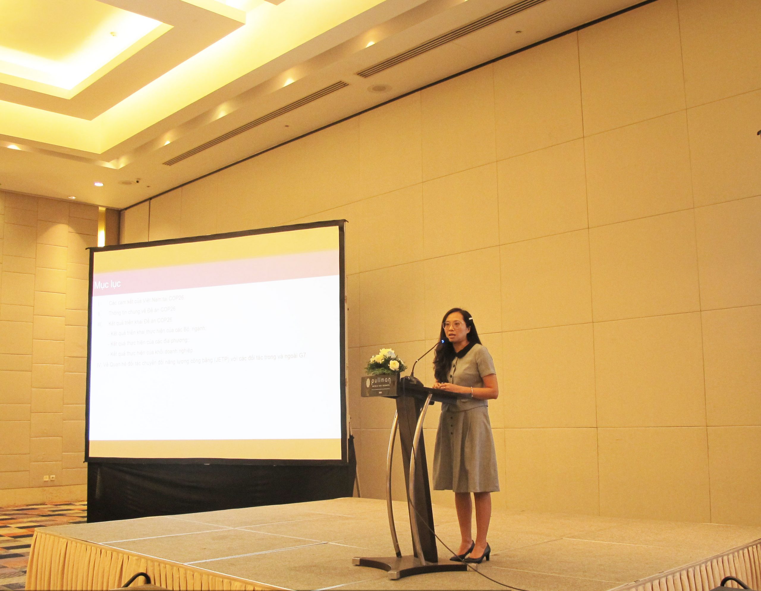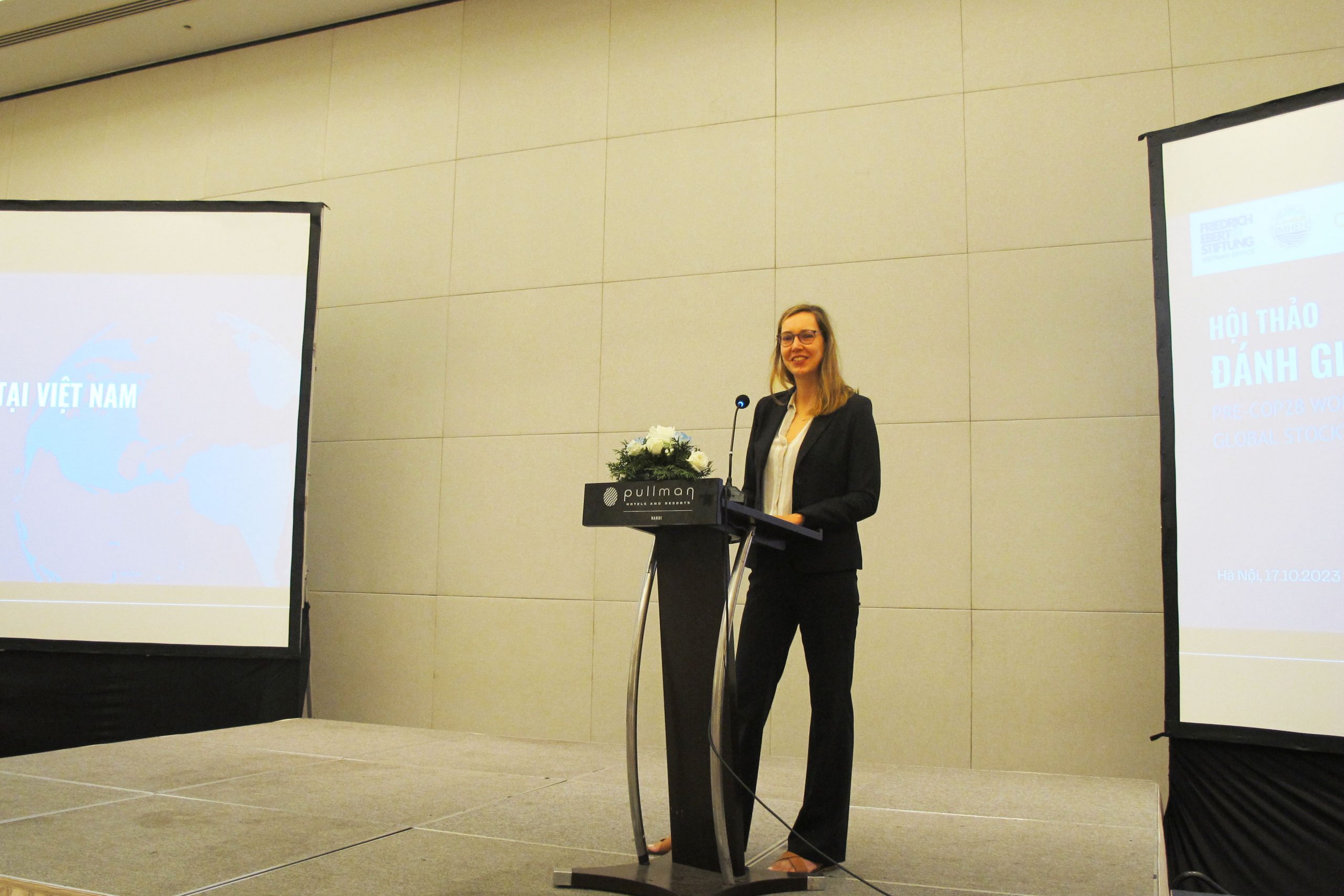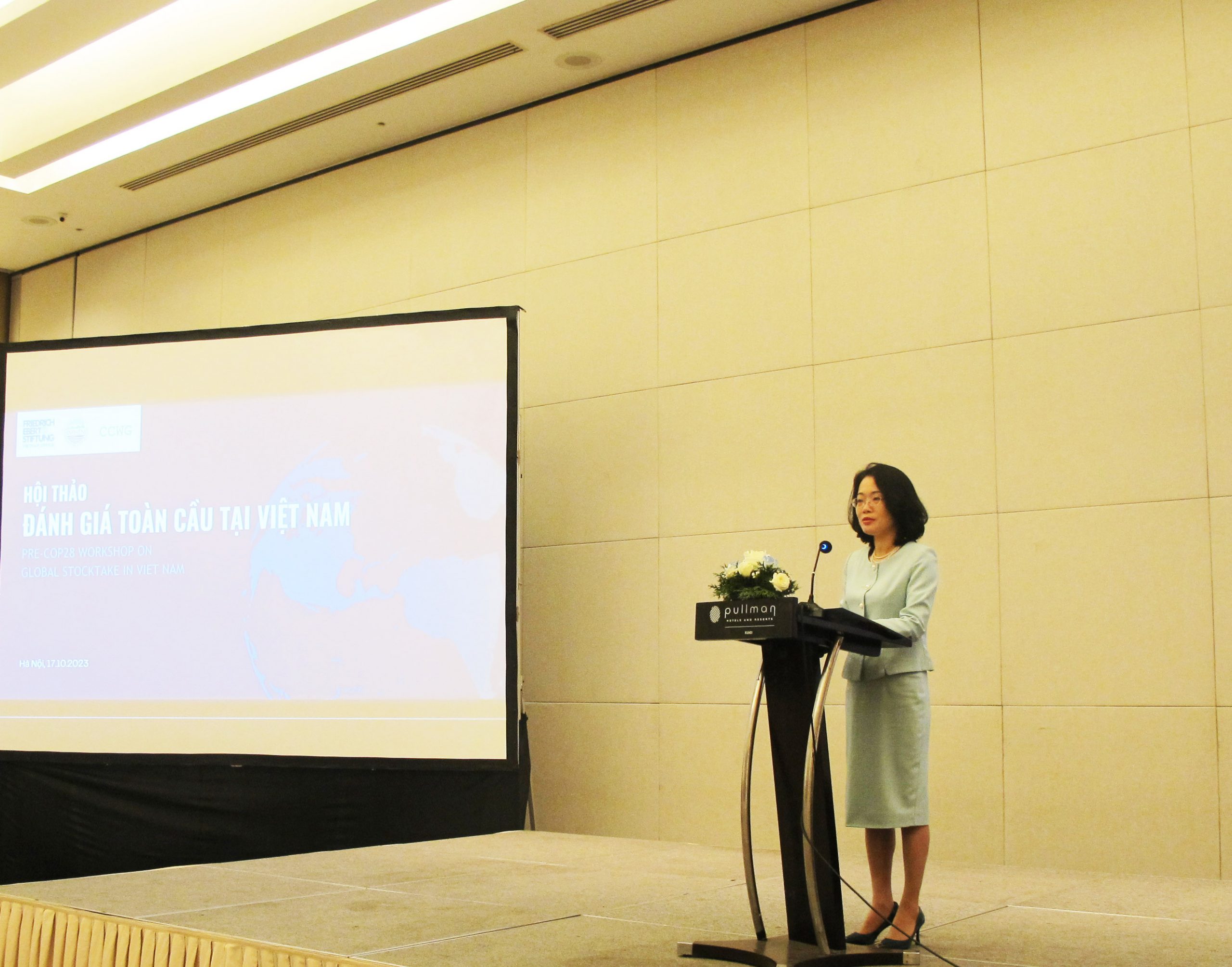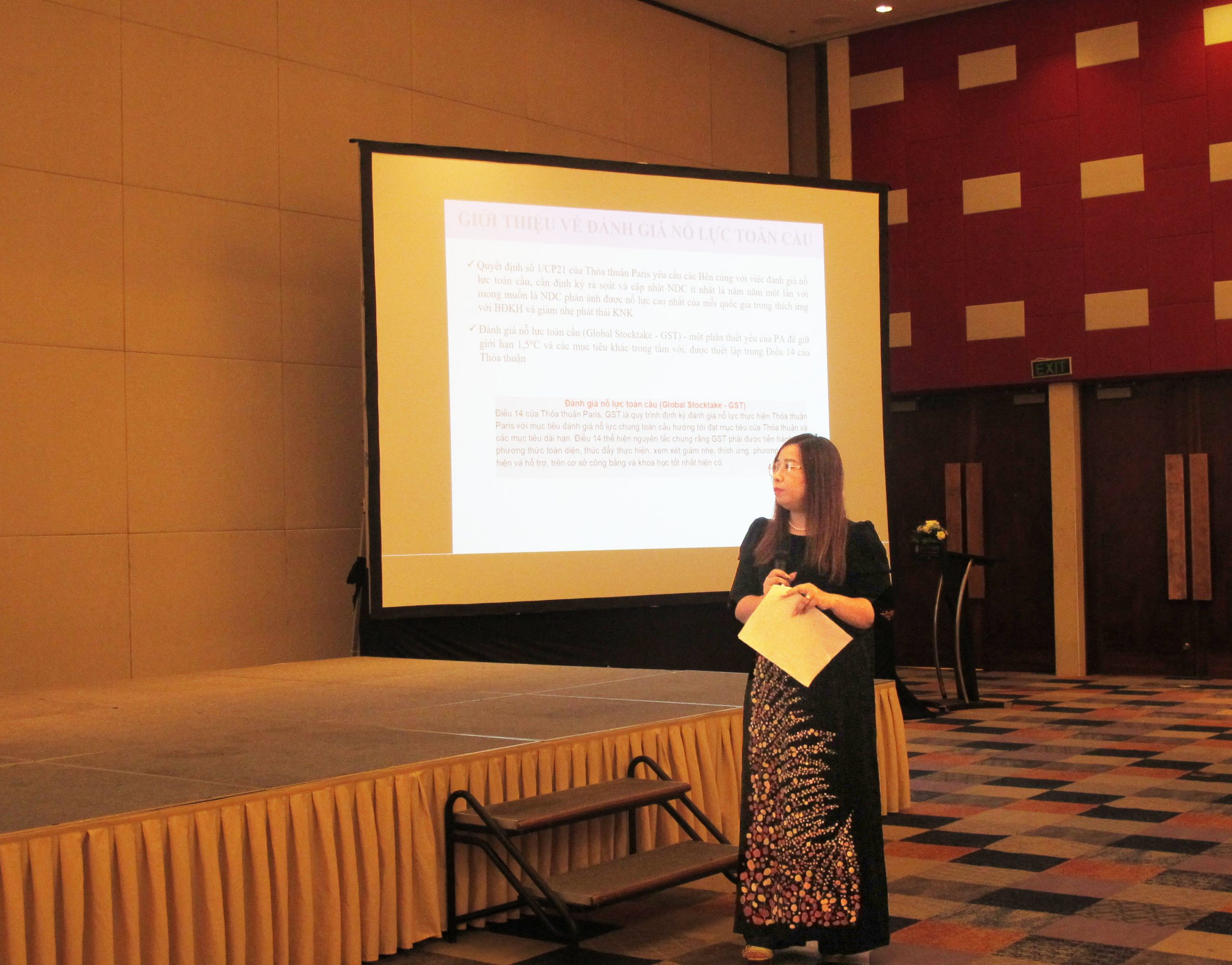Đại diện Viện KTTVBĐKH, bà Phùng Thị Thu Trang, Phó giám đốc trung tâm nghiên cứu Môi trường đồng thời là chuyên gia thực hiện báo cáo nghiên cứu về Global Stocktake đã có bài trình bày về kết quả báo cáo về thực hiện kiểm toán toàn cầu tại Việt Nam.