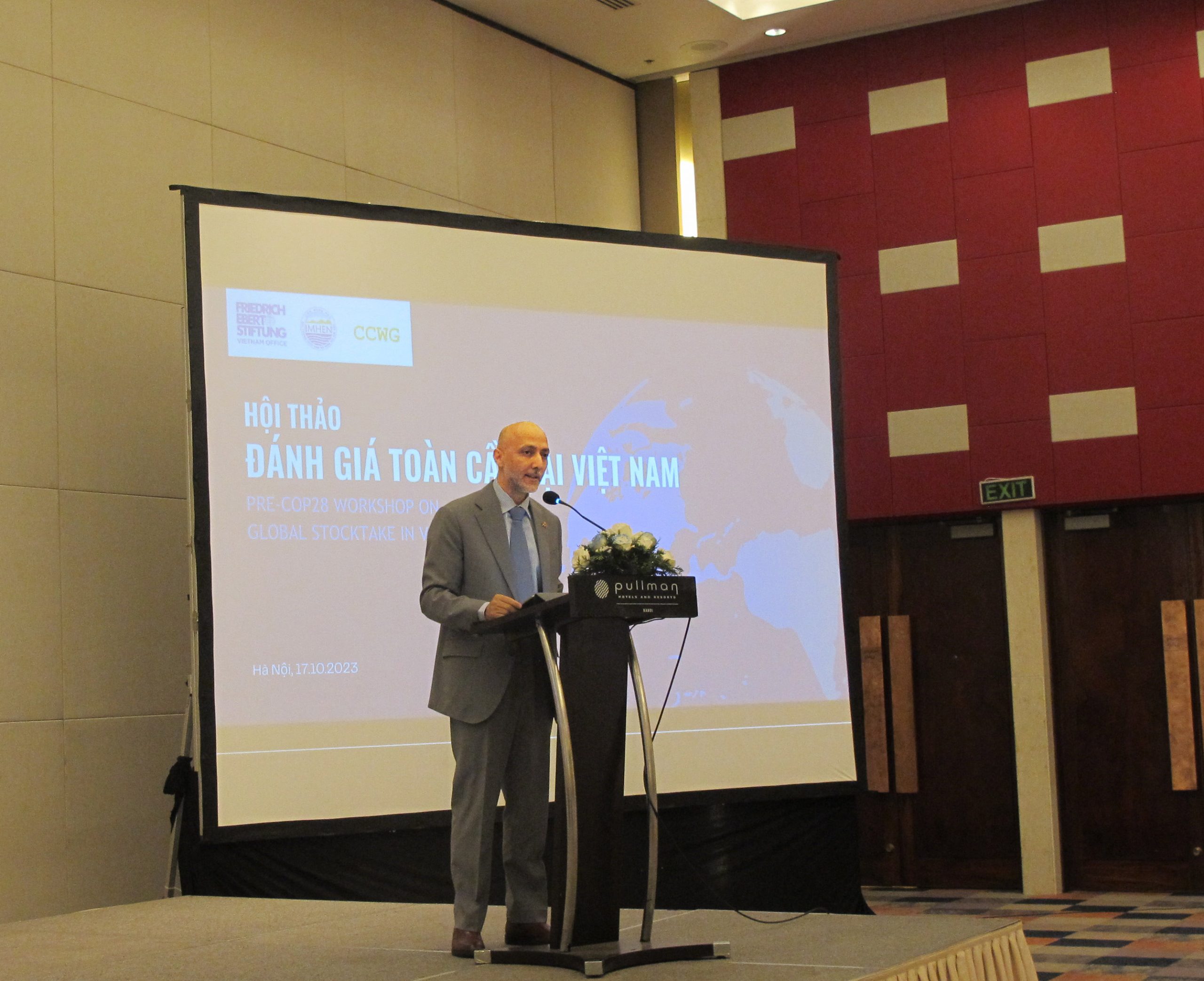 Tại hội thảo, bà Chu Thanh Hương (Trưởng phòng Khoa học Công nghệ và Hơp tác Quốc tế, Cục BĐKH) đã trình bày các cập nhật đáng chú ý trong quá trình thực hiện cam kết trong thỏa thuận Paris sau COP26 tại Việt Nam. Ông Philipp Beherns (Vụ trưởng Vụ Quỹ Sáng kiến khí hậu quốc tế, Bộ Kinh tế và Khí hậu, Cộng hòa Liên bang Đức) đã trình bày về những khái niệm Global Stocktake – Đánh giá nỗ lực toàn cầu toàn cầu, những kết quả chính trong quá trình thực hiện đã qua và những điểm cần đến sự nỗ lực trong thời gian tới. Bà Anushree Tripathi (chuyên gia thuộc Vụ Biến đổi khí hậu, Bộ Môi trường, Lâm nghiệp và Biến đổi khí hậu Ấn Độ) trình bày về bối cảnh thực hiện Global Stocktake trên thế giới và thông tin quan trọng  về quá trình nộp hồ sơ từ Ấn Độ.