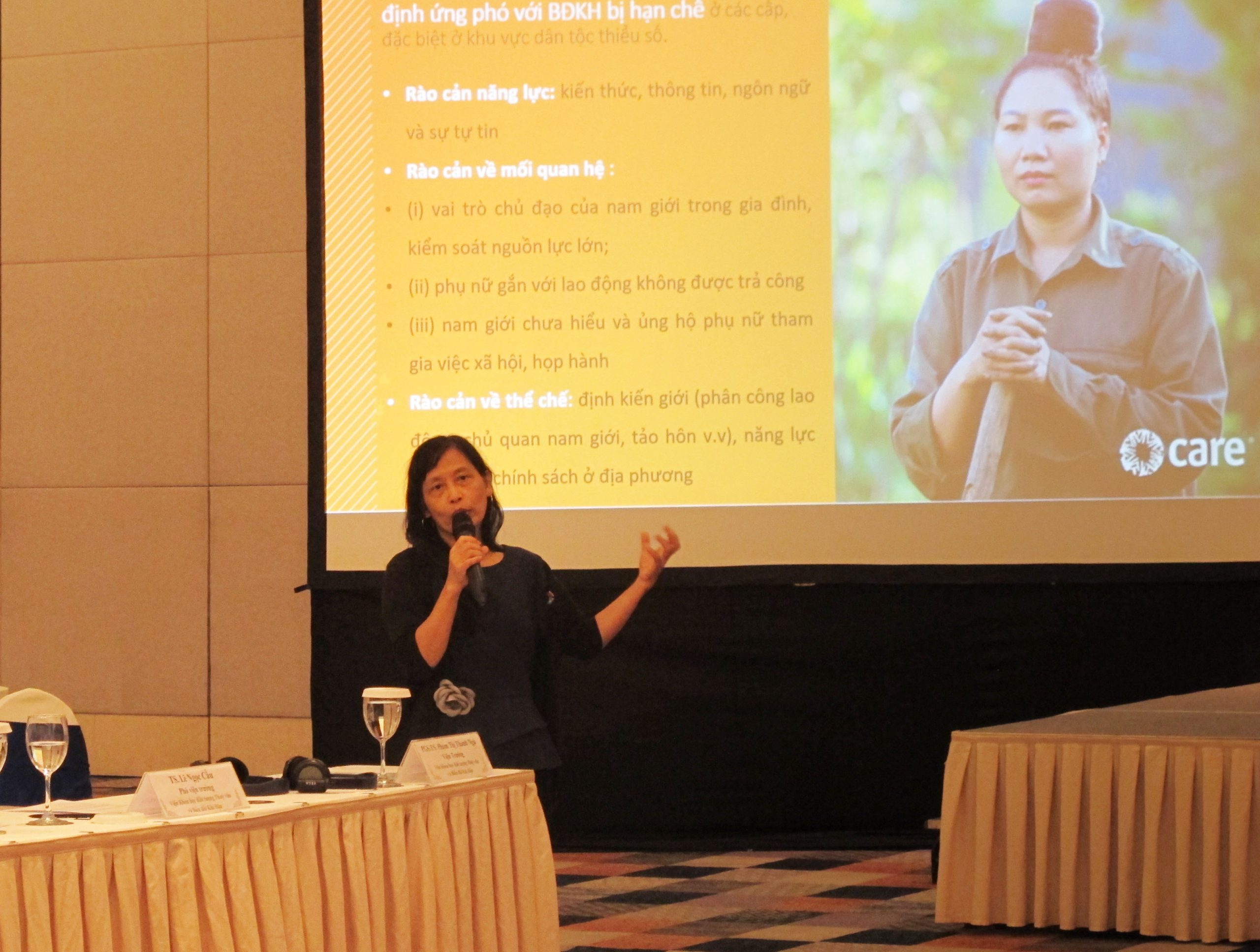 Là một trong những tổ chức đi đầu trong ứng phó với biến đổi khí hậu ở Việt Nam  tổ chức CARE Quốc tế tại Việt Nam đã có rất nhiều những dự án, hoạt động thành công tại cấp quốc gia và cấp địa phương. Bà Nguyễn Thị Yến, cố vấn kĩ thuật Khí hậu và Giảm nhẹ rủi ro thiên tai từ tổ chức CARE đã có bài trình bày về Giới và ứng phó với BĐKH. Trong đó nêu bật những gương phụ nữ điển hình thích ứng tốt với BĐKH từ dự án của các thành viên.