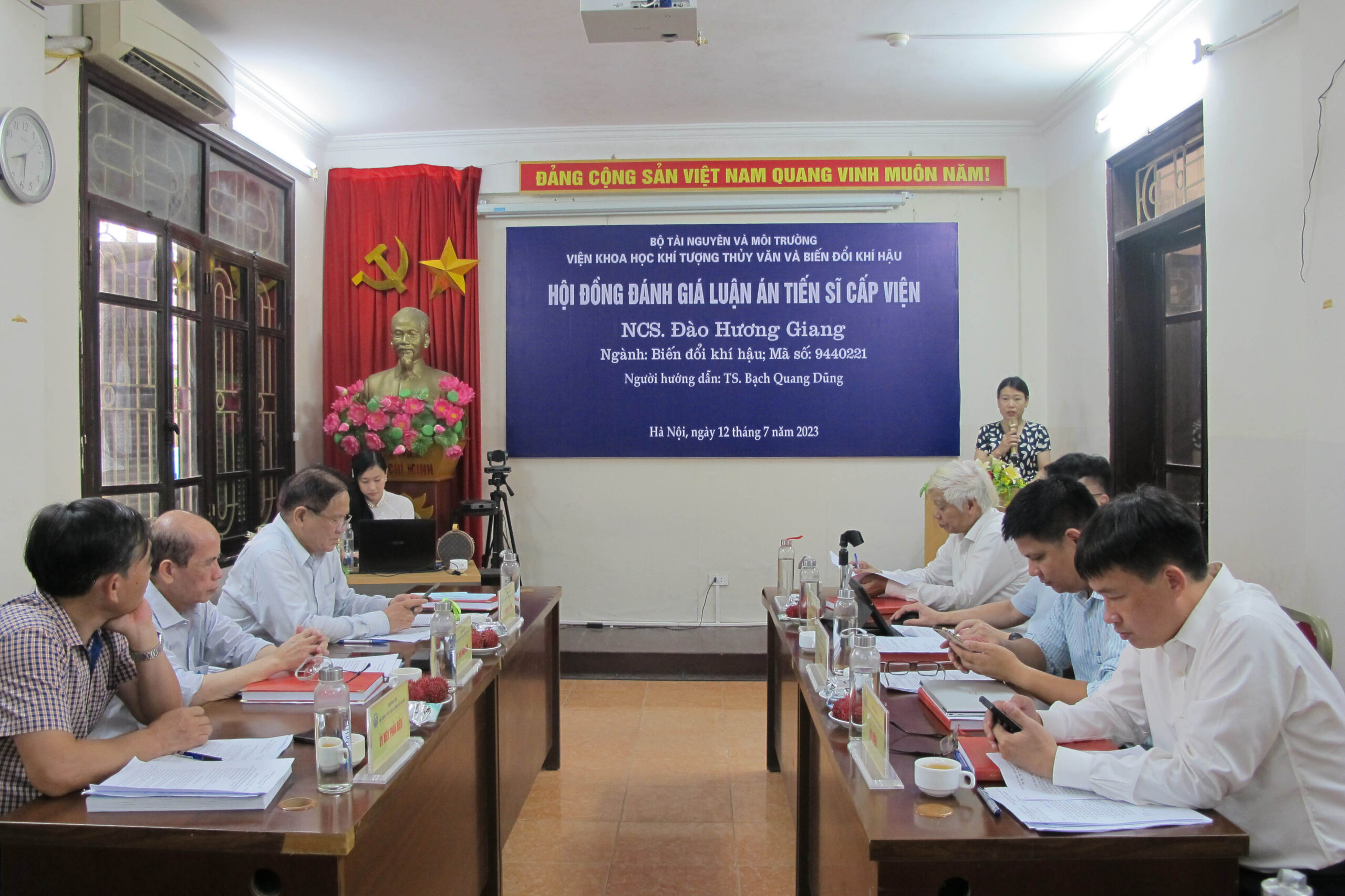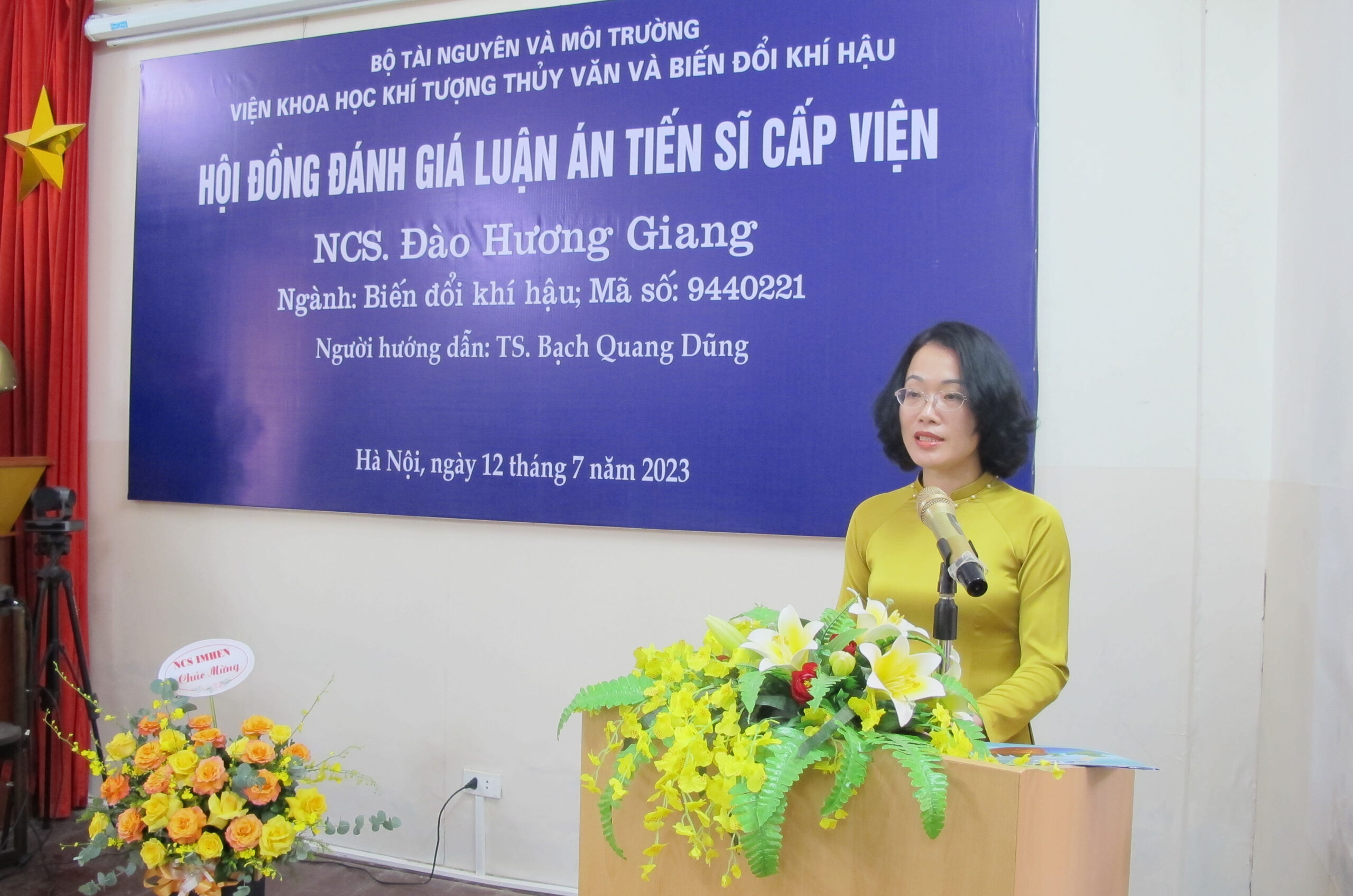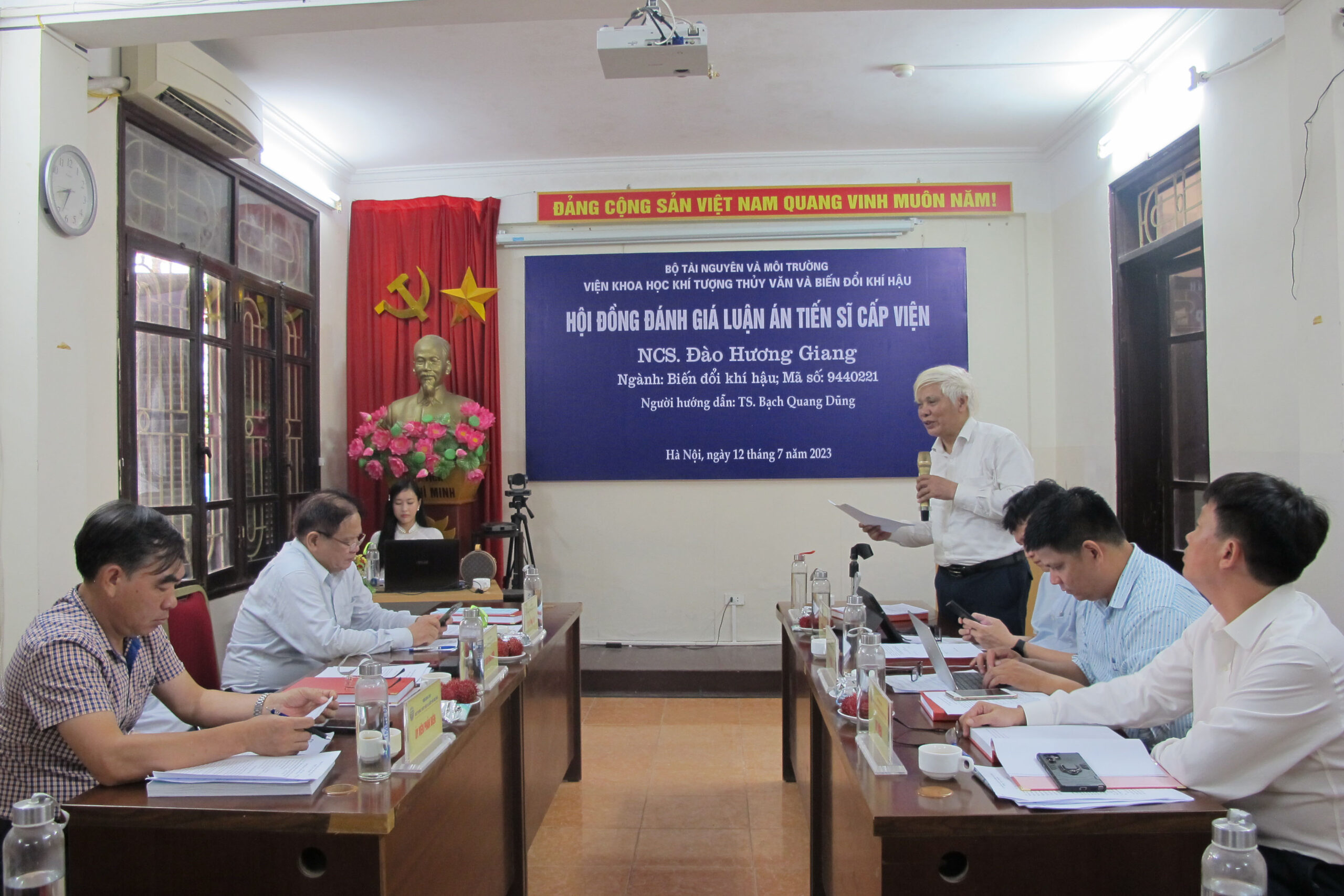 Tại buổi đánh giá, TS. Trần Thanh Thủy (Trưởng phòng Khoa học, Đào tạo và Hợp tác quốc tế) đã tuyên bố lý do, giới thiệu đại biểu và công bố Quyết định thành lập Hội đồng đánh giá luận án cấp Viện cho NCS. Đào Hương Giang. Cụ thể, theo Quyết định số 132/QĐ-VKTTVBĐKH, ngày 15 tháng 6 năm 2023 của Viện Trưởng Viện Khoa học Khí tượng Thủy văn và Biến đổi khí hậu, Hội đồng đánh giá luận án cấp Viện cho NCS. Đào Hương Giang gồm 7 thành viên gồm: GS. TSKH. Phạm Hoàng Hải (Viện Hàn lâm Khoa học và Công nghệ Việt Nam) là Chủ tịch Hội đồng; PGS. TS. Doãn Hà Phong (Viện Khoa học KTTVBĐKH) là Ủy viên Thư ký; PGS. TS. Nguyễn Thế Chinh (Viện Khoa học KTTVBĐKH) là Ủy viên phản biện 1; PGS. TS. Nguyễn Ngọc Thanh (Trường Đại học Tài nguyên và Môi trường Hà Nội) là Ủy viên phản biện 2; PGS. TS. Lê Xuân Tuấn (Trường Đại học Khoa học Tự nhiên) là Ủy viên phản biện 3; TS. Nguyễn Xuân Hiển (Trung tâm Hải văn – Tổng cục Khí tượng Thủy văn) và TS. Đặng Quang Thịnh (Viện Khoa học Khí tượng Thủy văn và Biến đổi khí hậu) là Ủy viên.