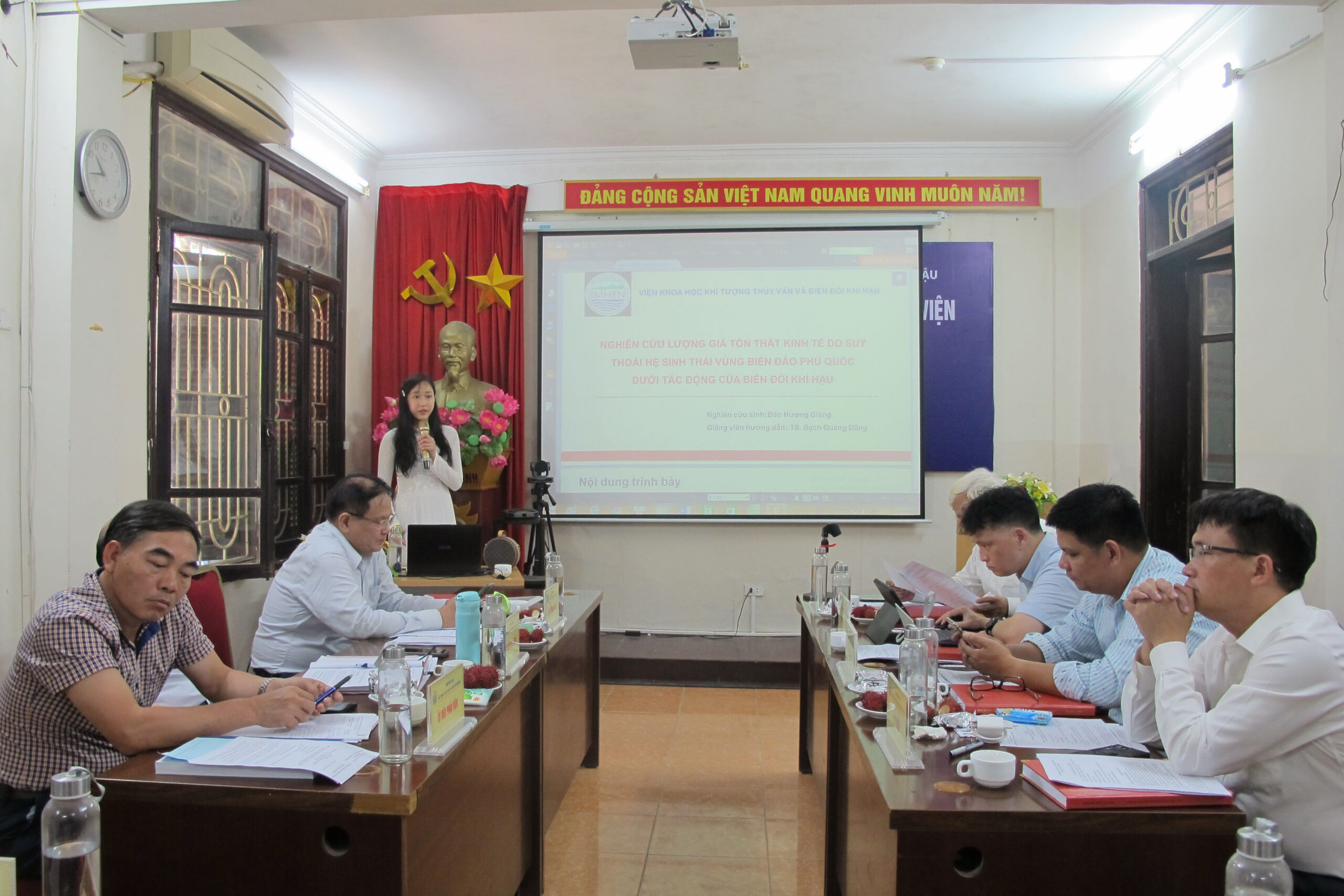 Sáng ngày 12/7, Viện Khoa học Khí tượng Thủy văn và Biến đổi khí hậu (KTTVBĐKH) tổ chức Hội đồng đánh giá luận án cấp Viện cho nghiên cứu sinh (NCS) Đào Hương Giang với đề tài luận án: “Nghiên cứu lượng giá tổn thất kinh tế do suy thoái hệ sinh thái vùng biển đảo Phú Quốc dưới tác động của biến đổi khí hậu”, ngành: Biến đổi khí hậu; Mã số: 9440221.