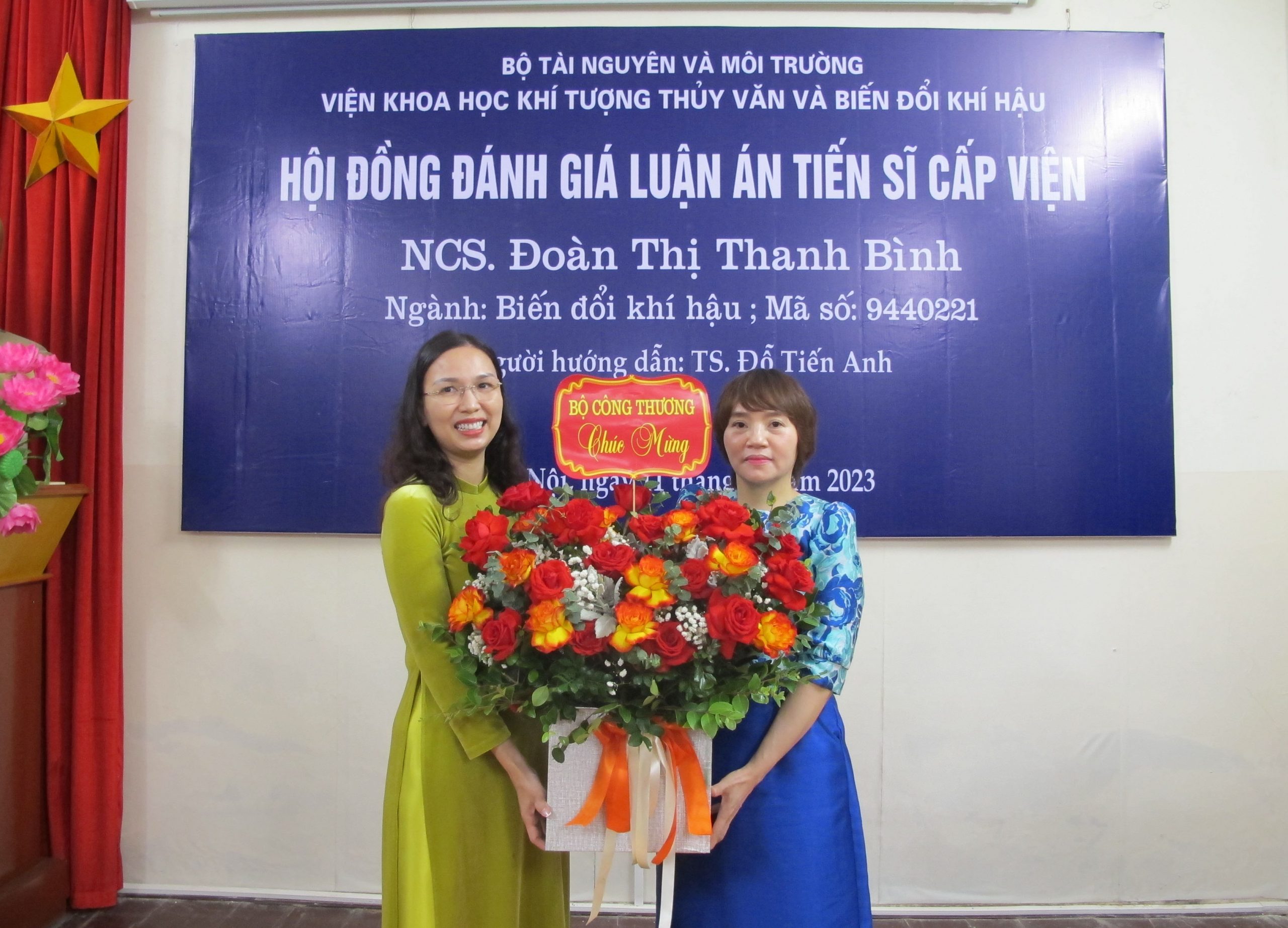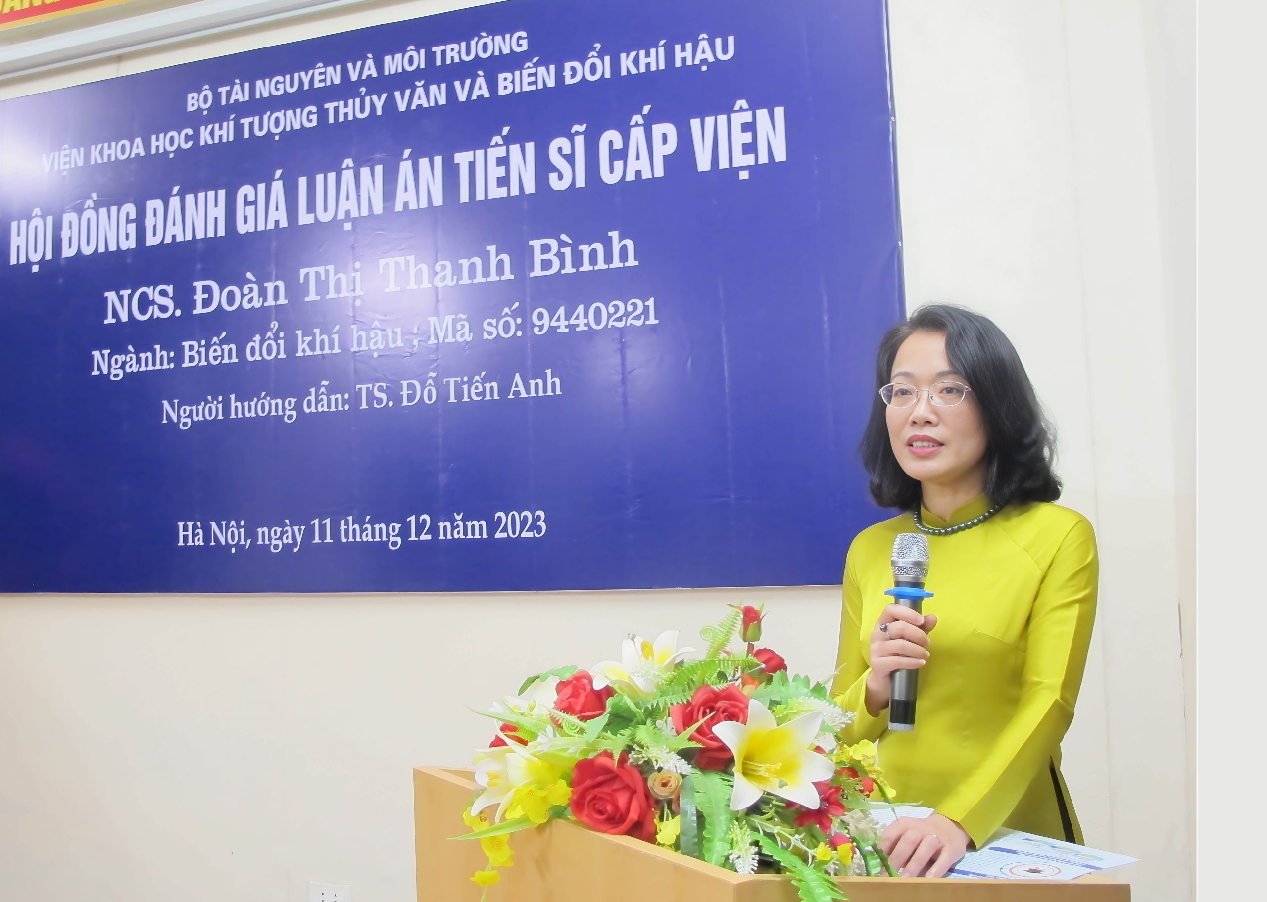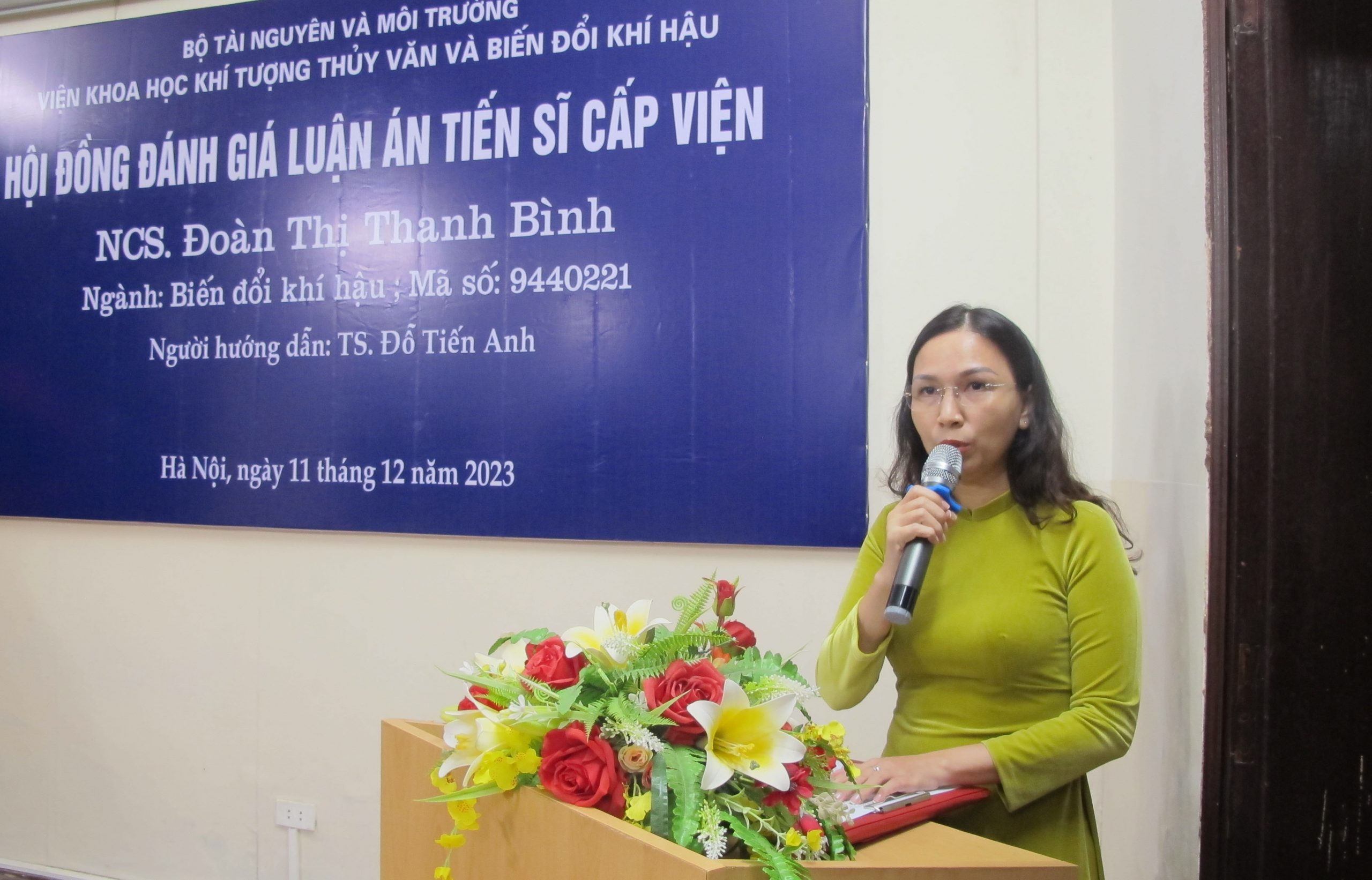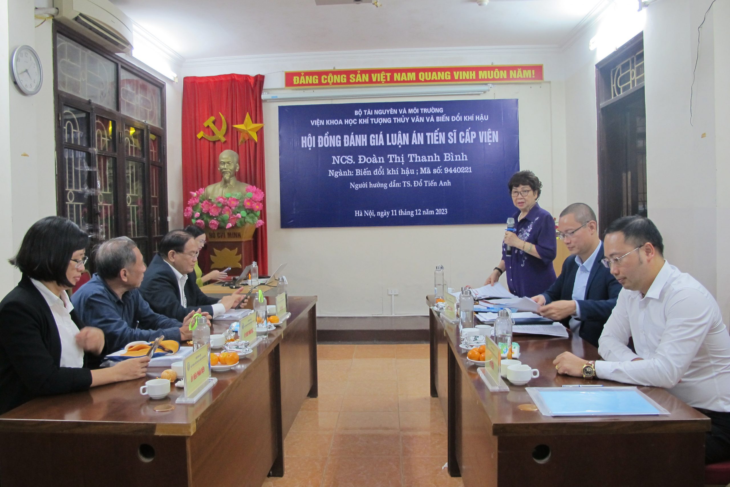 Tại buổi đánh giá, ThS. Phạm Ngọc Vinh (Phó Trưởng phòng Khoa học, Đào tạo và Hợp tác quốc tế) đã tuyên bố lý do, giới thiệu đại biểu và công bố Quyết định thành lập Hội đồng đánh giá luận án cấp Viện cho NCS. Đoàn Thị Thanh Bình. Cụ thể, theo Quyết định số 310/QĐ-VKTTVBĐKH, ngày 16 tháng 11 năm 2023 của Viện Trưởng Viện Khoa học Khí tượng Thủy văn và Biến đổi khí hậu, Hội đồng đánh giá luận án cấp Viện cho NCS. Đoàn Thị Thanh Bình gồm 7 thành viên: GS. TS. Đặng Thị Kim Chi (Hội Bảo vệ Thiên nhiên và Môi trường Việt Nam) là Chủ tịch Hội đồng; TS. Lê Ngọc Cầu (Viện Khoa học KTTVBĐKH) là Ủy viên Thư ký; PGS. TS. Lê Hà Thanh (Trường Đại học Kinh tế Quốc dân) là Ủy viên phản biện 1; PGS. TS. Lưu Đức Hải (Trường Đại học Khoa học Tự nhiên) là Ủy viên phản biện 2; TS. Lương Quang Huy (Cục Biến đổi khí hậu) là Ủy viên phản biện 3; PGS. TS. Nguyễn Thế Chinh (Viện Khoa học KTTVBĐKH) và PGS. TS. Đoàn Quang Trí (Tổng cục Khí tượng Thủy văn) là Ủy viên.