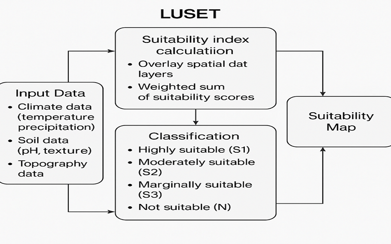 Mô hình LUSET (Land Use Suitability Evaluation Tool) được sử dụng để tính toán chỉ số phù hợp tổng hợp theo từng ô lưới không gian, dựa trên nguyên lý chồng lớp dữ liệu (overlay) và trọng số các yếu tố sinh thái. Các chỉ số này sau đó được phân loại theo thang điểm tương ứng với mức S1–S2–S3–N. Cấu trúc mô hình LUSET được minh hoạ như trong Hình 1.