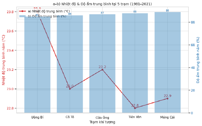 Nhiệt độ trung bình năm dao động từ 22.8°C (Tiên Yên) đến 23.8°C (Uông Bí), cao hơn so với ngưỡng sinh thái lý tưởng của cây sâm (14-18°C). Tuy nhiên, theo quy luật giảm nhiệt theo độ cao (0.6°C/100 m), tại các khu vực có độ cao >1.000 m như Ba Chẽ, Bình Liêu, Thanh Sơn, nền nhiệt có thể dao động từ 17-20°C, tiệm cận điều kiện sinh trưởng lý tưởng (Hình 1a).