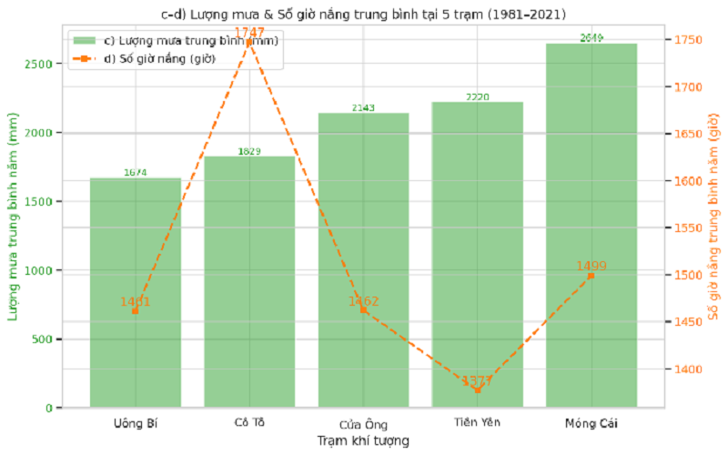 Lượng mưa trung bình năm đạt từ 1.674 mm (Uông Bí) đến 2.649 mm (Móng Cái), trong đó các trạm Tiên Yên, Cửa Ông, Móng Cái đều có lượng mưa >2.400 mm/năm, đáp ứng ngưỡng nhu cầu cao về độ ẩm của cây sâm (Hình 1b).