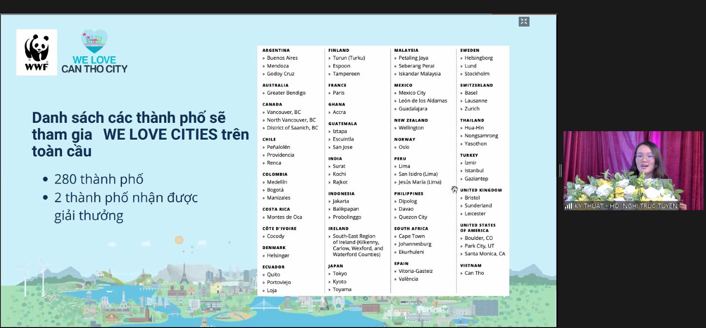 Chia sẻ tại Hội thảo, bà Võ Nguyễn Minh Thùy (Tư vấn viên WWF Việt Nam) cho biết, chiến dịch truyền thông WE LOVE CẦN THƠ CITY tại TP. Cần Thơ sẽ diễn ra trong 5 tuần với 5 chủ đề khác nhau. Tuần 1 – Sự chuyển dịch đô thị sẽ giới thiệu 10 lĩnh vực trọng điểm để Cần Thơ trở thành đô thị đông minh và sự phát triển của hệ thống giao thông công cộng. Tuần 2 – Hệ thống thực phẩm sẽ giới thiệu chế độ ăn tốt cho con người và mô hình sản xuất nông sản chất lượng cao. Tuần 3 – Cơ sở hạ tầng sẽ giới thiệu các sáng kiến phát triển cơ sở hạ tầng thích ứng với BĐKH tại Cần Thơ. Tuần 4 – Giải pháp dựa trên tự nhiên sẽ giới thiệu Các giải pháp hạ tầng xanh thích ứng ngập lụt và hình mẫu “người anh hùng” luôn hành động vì khí hậu. Tuần 5 – Rác thải và tái chế sẽ giới thiệu về những nỗ lực của TP. Cần Thơ trong giảm thiểu và loại bỏ rác thải.