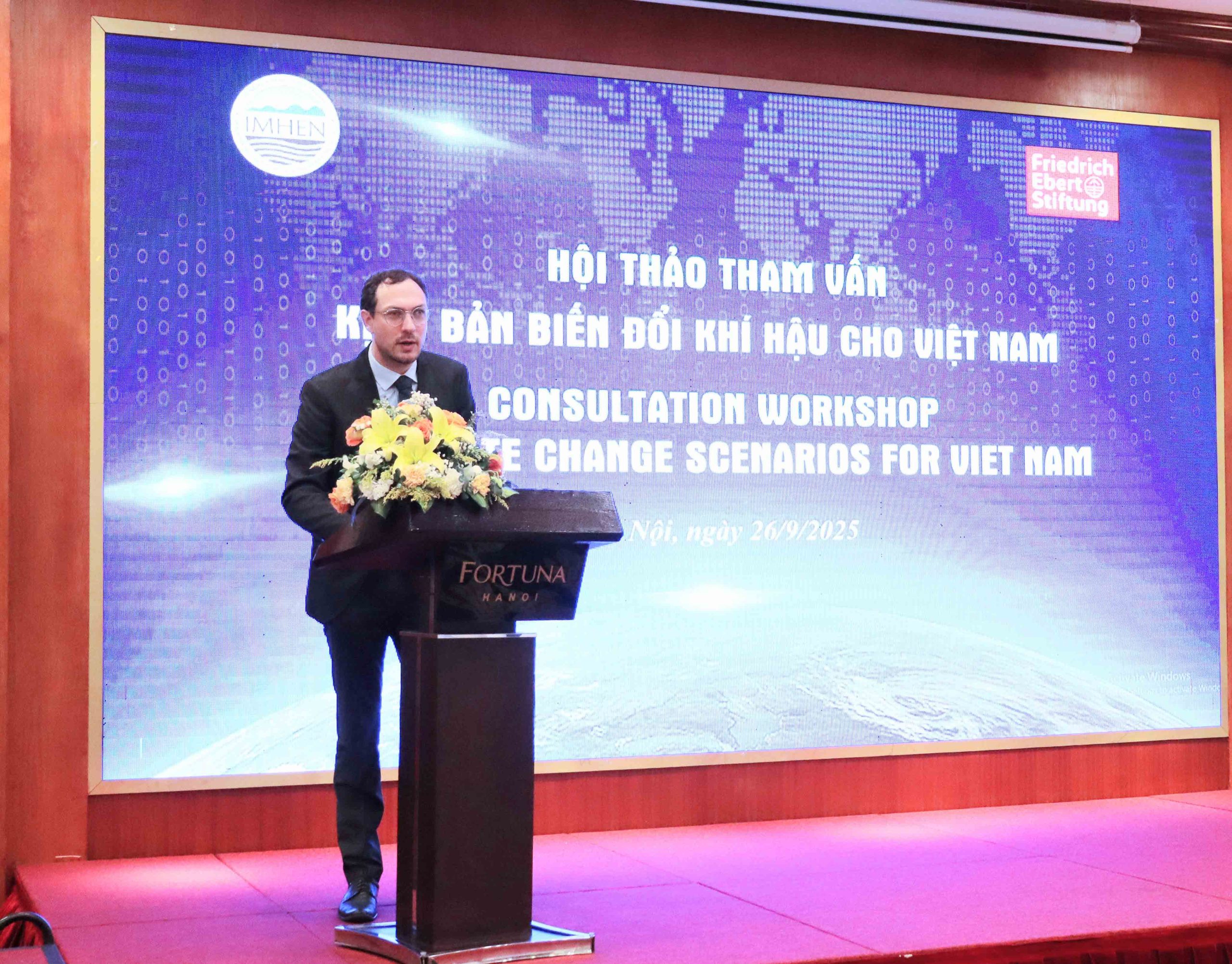 Đồng quan điểm với Bà Ngà, Ông Timo Rinke (Trưởng đại diện Viện FES Việt Nam) lần nữa nhấn mạnh ý nghĩa quan trọng của việc tham vấn kịch bản biến đổi khí hậu cho Việt Nam và chúc mừng Viện KTTVBĐKH trong nỗ lực xây dựng kịch bản BĐKH cập nhật đến năm 2100 cho Việt Nam. Hội thảo được coi là diễn đàn quan trọng để kết nối các cơ quan nhà nước, giới khoa học, khu vực tư nhân và tổ chức xã hội, góp phần thúc đẩy hợp tác và đối thoại về ưu tiên khí hậu của Việt Nam.