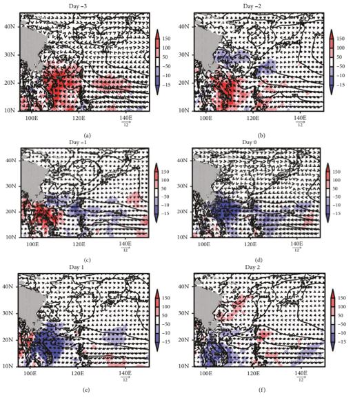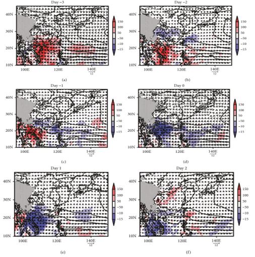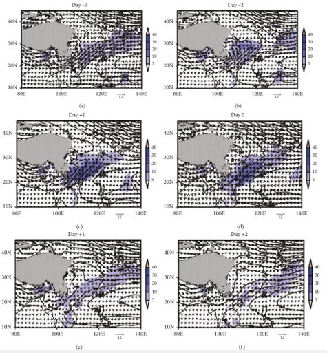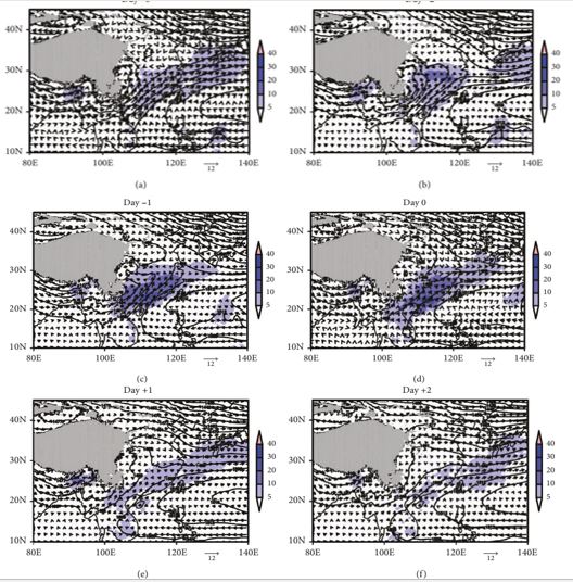 Mô hình quy mô lớn liên quan đến các sự kiện mưa được hiển thị trong Hình 1. Vào ngày thứ -3, một xoáy quy mô trung bình liên quan đến mực thấp xuất hiện rõ ràng ở phía đông của Cao nguyên Tây Tạng. Vài ngày sau, xoáy lan truyền về phía nam dọc theo phía đông của Cao nguyên Tây Tạng, theo sau là một xoáy lớn, theo đó mưa lớn xảy ra. Xoáy tiến vào Bắc Bộ trong ngày -2, phù hợp với khả năng xuất hiện mưa lớn ở vùng núi. Trong ngày 0, trong khi xoáy mất cấu trúc và tan dần thì lượng mưa vẫn duy trì ở Bắc Bộ. Cuối cùng, không còn mưa vào ngày +2, đồng thời kết thúc mưa ở Bắc Bộ. Sự hình thành của xoáy có thể liên quan đến sự hình thành chu kỳ gió của Cao nguyên Tây Tạng. Khi gió mạnh thổi từ tây sang đông trên Cao nguyên Tây Tạng, tạo ra sóng và gió sườn khuất gió. Gió ở sườn khuất gió gây ra sự phân tách lớn hơn về đẳng entropi giữa tầng đối lưu trên và tầng dưới. Sự tách biệt này cho thấy sự bất ổn định tĩnh theo chiều thẳng đứng ngày càng tăng, do đó gây ra xoáy ở mực thấp. Theo đó, gió hội tụ mạnh và trung tâm mưa lớn liên quan của nó được quan trắc thấy ở khu vực phía nam của xoáy thuận.