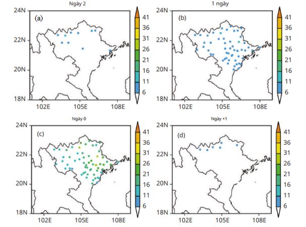 Trong những trường hợp này, đợt KKL cũng góp phần đáng kể vào sự xuất hiện của lượng mưa lớn. Như thể hiện trong Hình 5, gió đông bắc mạnh kết hợp với một vùng áp cao rộng lớn xâm nhập từ Siberia vào phía đông nam Trung Quốc từ ngày -3 đến ngày -1. Vào ngày 0, gió đông bắc thịnh hành trên Biển Đông Bắc Việt Nam, đồng thời với sự xuất hiện của rãnh trên cao ở Bắc Bộ. Khi các dòng không khí bị đẩy lên bởi các dãy núi cao, nó được tăng tốc bởi lực nâng tựa địa tỉnh gây ra bởi rãnh tầng trên. Kết quả là đã gây ra chuyển động thẳng đứng mạnh mẽ, dẫn đến sự xuất hiện của mưa lớn ở miền Bắc, đặc biệt là ở khu vực miền núi.