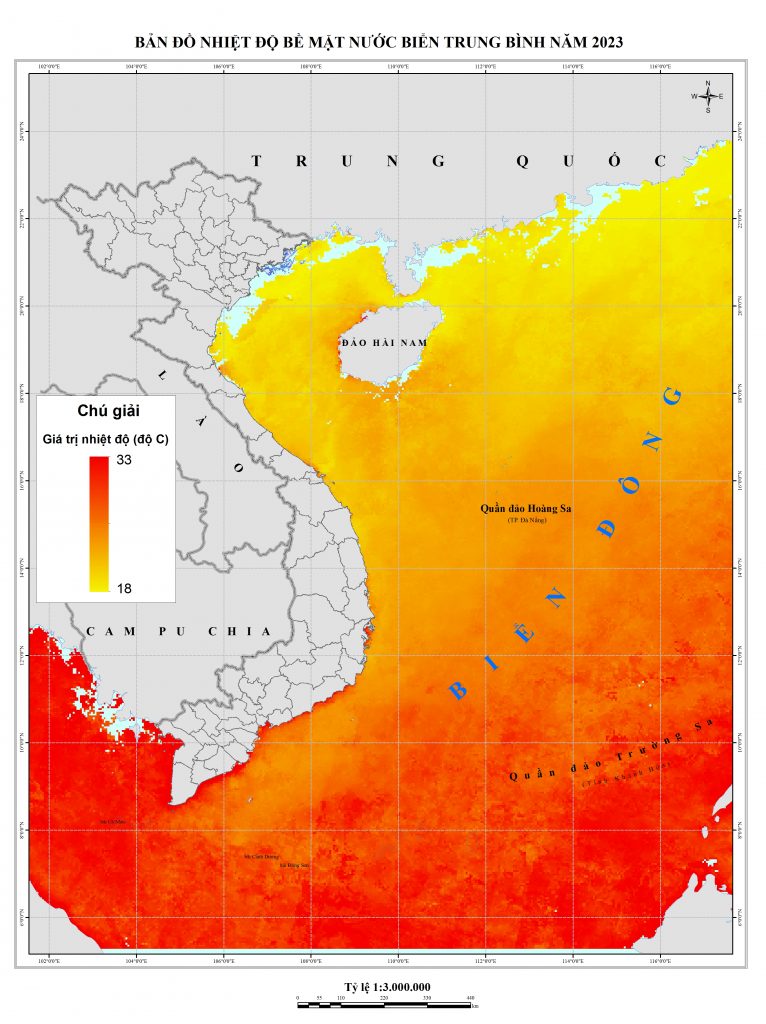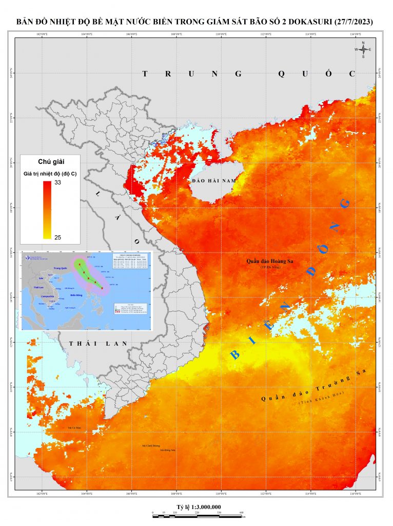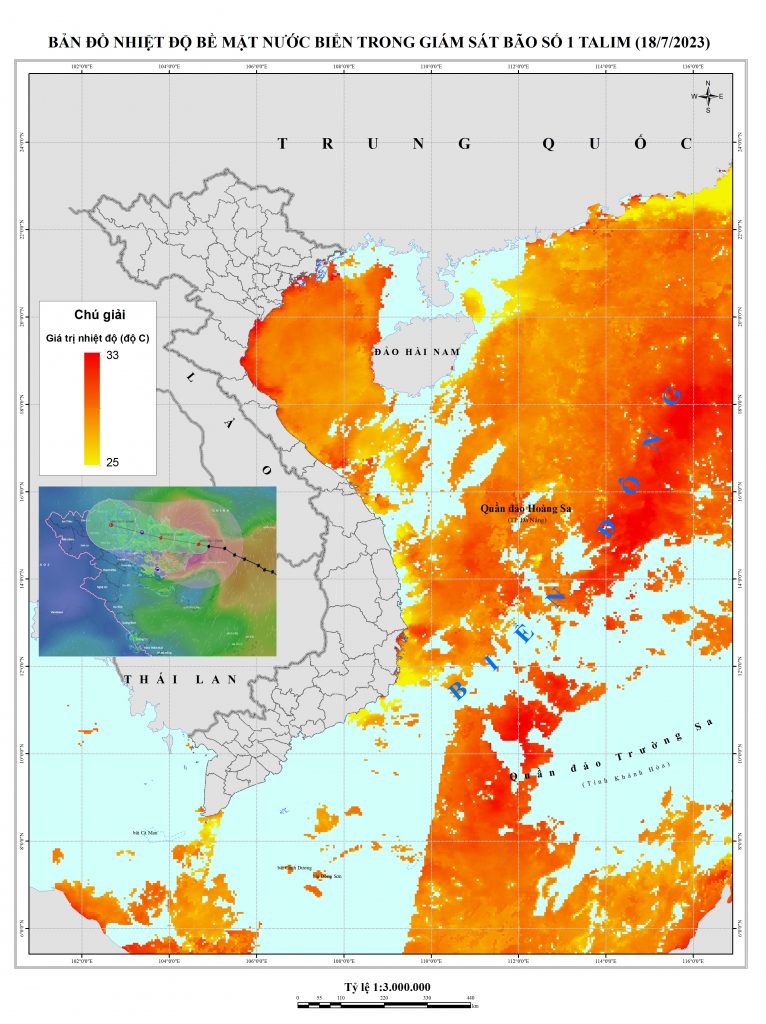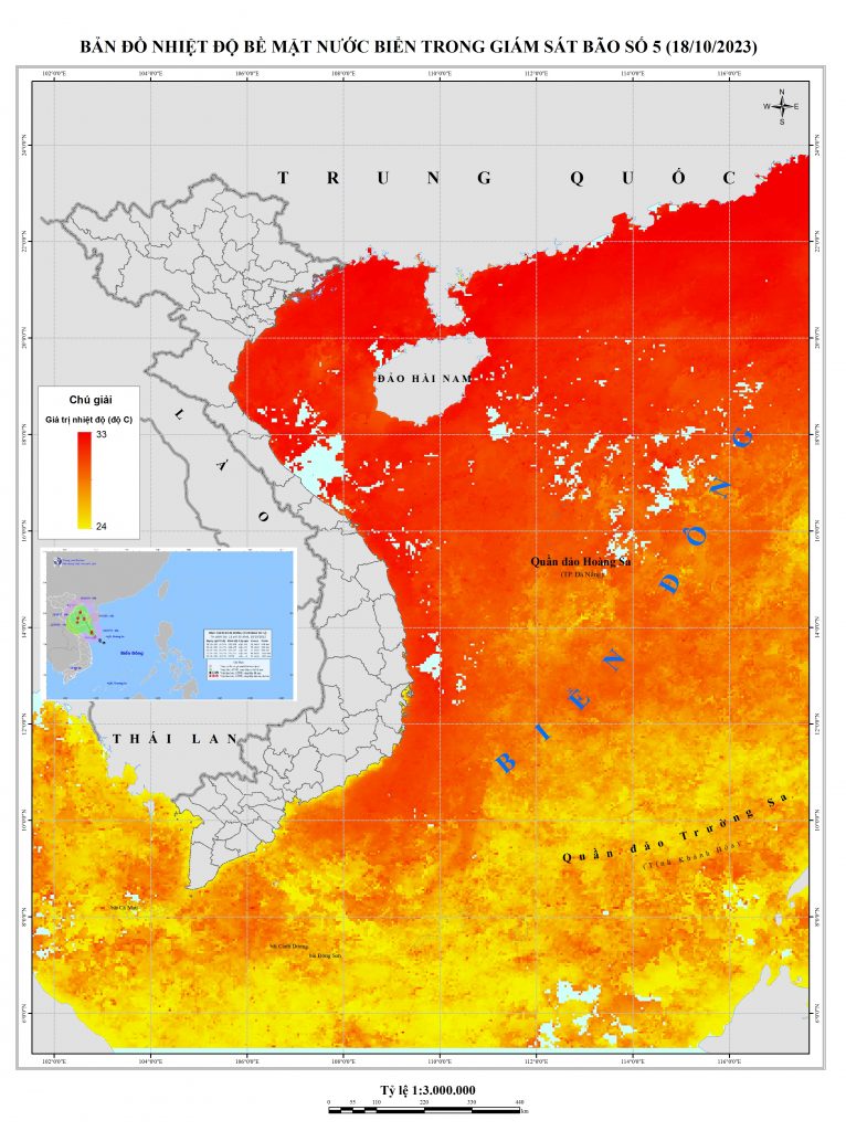 Hệ thống các ảnh thu thập để xây dựng bản đồ là ảnh lấy khoảng 15/11-ngày 19/11/2023, khoảng thời gian này bão đã đổ bộ vào đất liền thuộc khu vực Quảng Ninh – Thái Bình nên có thể khu vực này tích tụ nhiều mây, nhiệt độ đã giảm đi so với khi hình thành bão khoảng trên 250C. Còn nhiệt độ tại các khu vực biển của Việt Nam còn lại có xu hướng trên 300C.