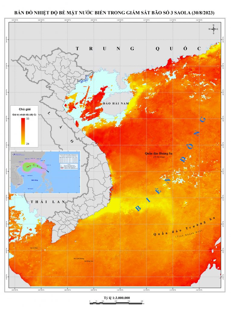 Bão SAOLA mạnh cấp 15-16, giật trên cấp 17 đã đi vào Biển Đông trở thành cơn bão số 3. Chiều 30/8, bão SAOLA đi vào vùng biển phía Đông Bắc của khu vực Bắc Biển Đông, trở thành cơn bão số 3 trong năm 2023. Trên bản đồ ở khu vực biển quần đảo Hoàng Sa nhiệt độ dao động trong khoảng 28-330C. Các khu vực khác nhiệt độ hầu hết dưới 28 độ C.