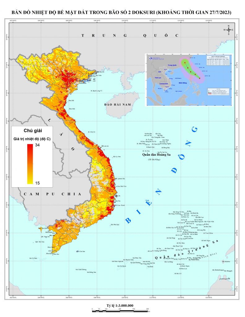 Khi cơn bão số 2 Doksuri đổ bộ vào đất liền địa phận Trung Quốc trong khoảng thời gian từ 24/7-27/7/2023 nhiệt độ mặt đất đã có sự biến đổi. Các tỉnh ven biển Bắc Trung Bộ và Nam Trung Bộ đều có nền nhiệt cao lên đến 34 độ C trong khi đó các khu vực con lại nhiệt độ dao động từ 15 đến 30 độ C