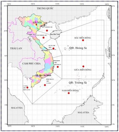 Vị trí 20 điểm ven bờ biển Việt Nam và khu vực Bắc, Biữa và Bam Biển Đông. Ảnh: Báo cáo tiềm năng gió, sóng ngoài khơi tại các vùng biển Việt Nam