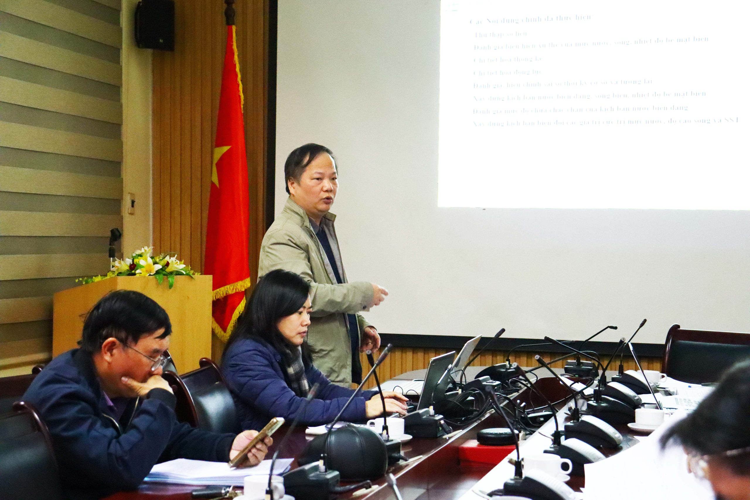 Trình bày tại buổi đánh giá, TS. Lê Quốc Huy (đại diện Trung tâm Nghiên cứu Thủy văn và Hải văn) đã giới thiệu các nội dung công việc thực hiện năm 2024 gồm: Thu thập số liệu; Đánh giá biểu hiện xu thế của mực nước, sóng, nhiệt độ bề mặt biển; Chi tiết hoá thống kê; Chi tiết hoá động lực; Đánh giá, hiệu chỉnh sai số thời kỳ cơ sở và tương lai; Xây dựng kịch bản nước biển dâng, sóng biển, nhiệt độ bề mặt biển; Đánh giá mức độ chưa chắc chắn của kịch bản nước biển dâng; Xây dựng kịch bản biến đổi các giá trị cực trị mực nước, độ cao sóng và SST.
