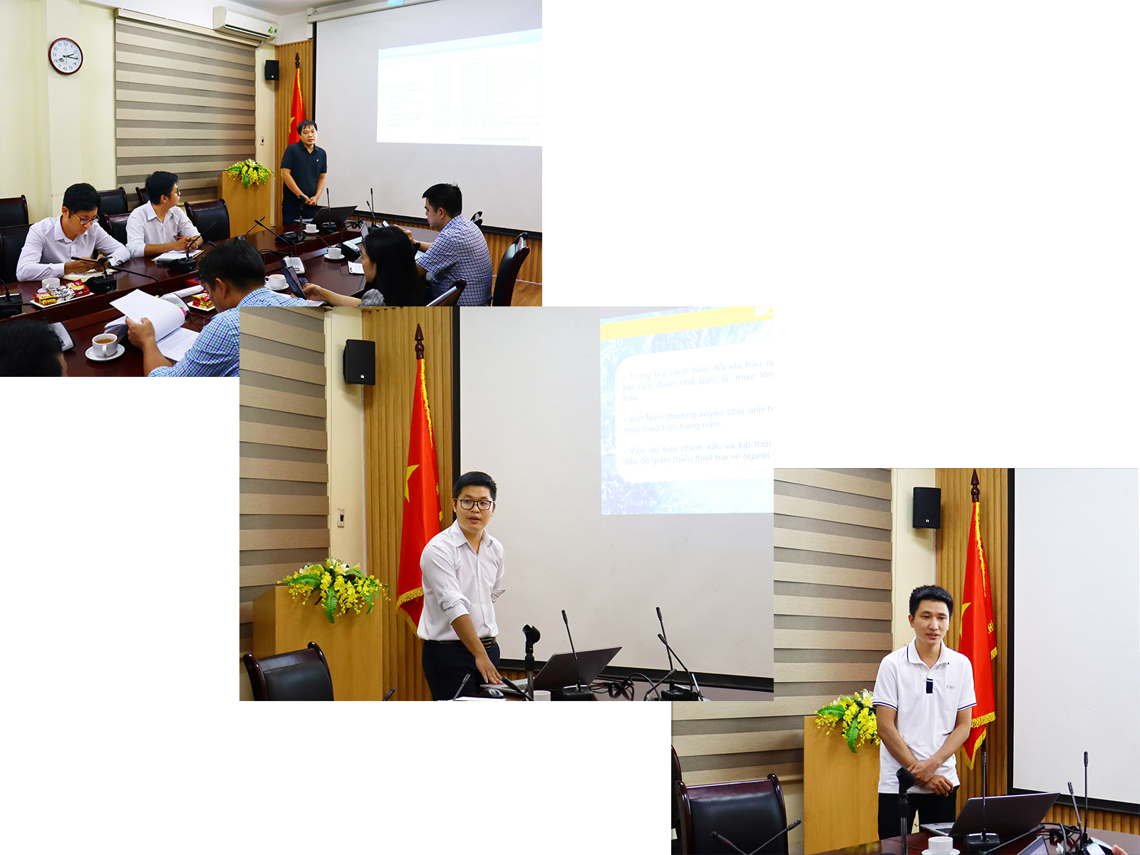 Dưới sự chủ trì của TS. Nguyễn Quốc Khánh (Phó Viện trưởng Viện KTTVBĐKH), các chuyên gia tham dự hội thảo đã nghe nhóm thực hiện đề tài báo cáo các kết quả đạt được tính đến thời điểm hiện tại. Cụ thể, ThS. Nguyễn Văn Nam đã trình bày về nghiên cứu phương pháp, kỹ thuật hoà hợp (blending techniques) sóng và di chuyển xoáy phục vụ bài toán dự báo cường độ, quỹ đạo bão, gió mạnh và mưa lớn trong bão trên khu vực Biển Đông và Việt Nam.