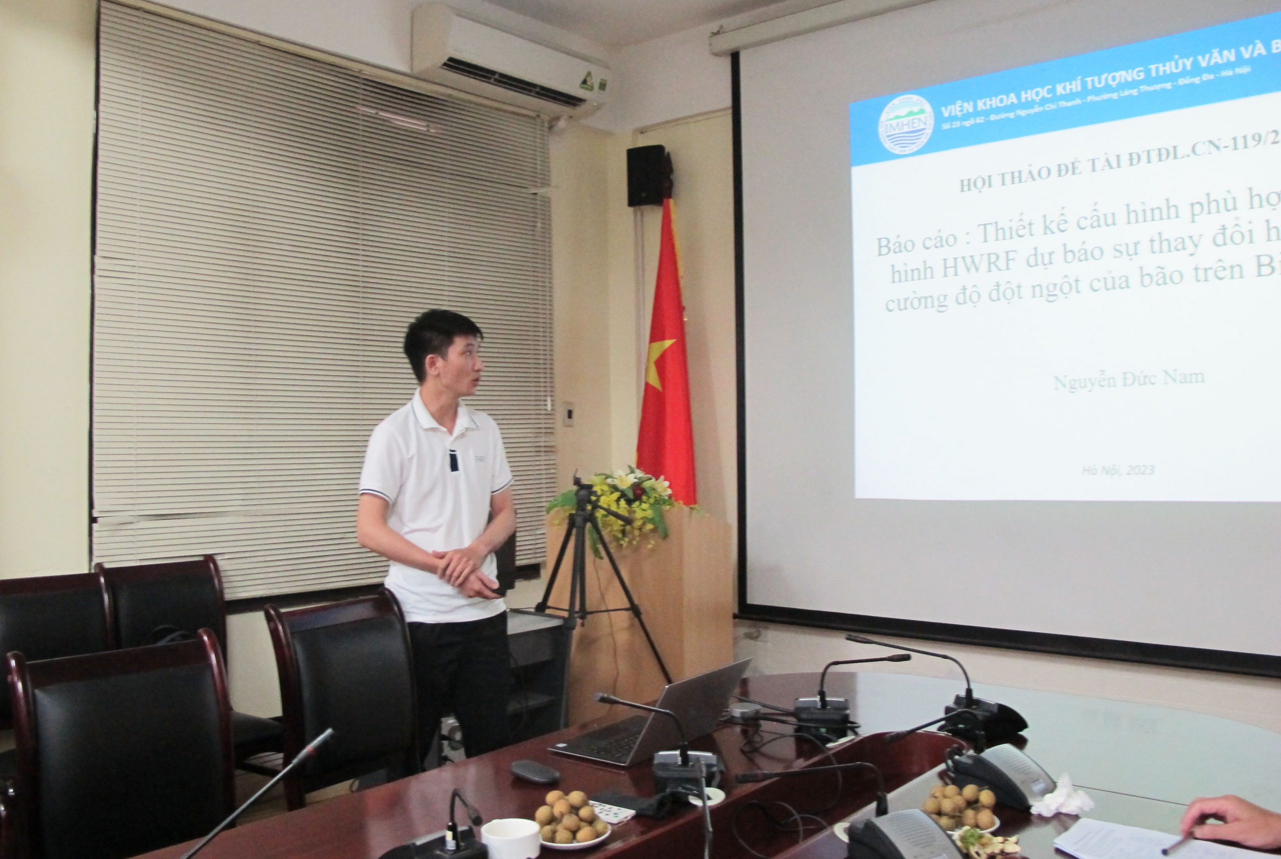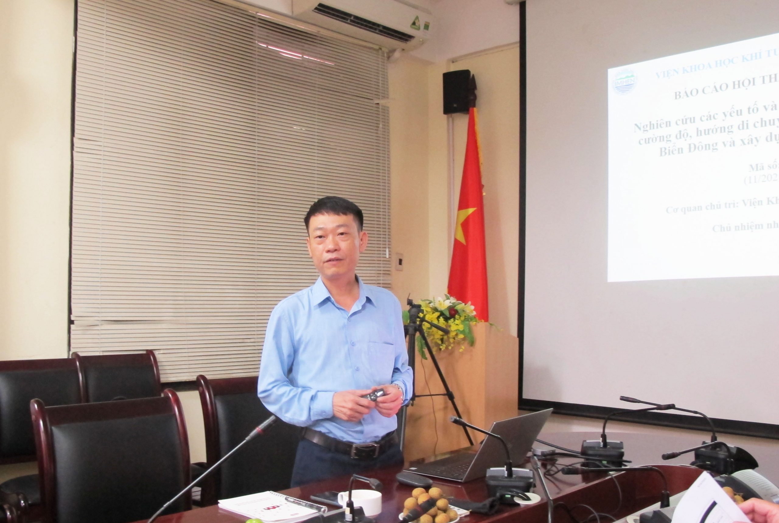 Tại hội thảo, TS. Vũ Văn Thăng, chủ nhiệm đề tài, đại diện nhóm thực hiện đã trình bày giới thiệu về mục tiêu, tiến độ, sản phẩm mà đề tài đã đạt được đến thời điểm hiện tại. Theo đó, đề tài có 2 mục tiêu chính là: 1) Xác định được vai trò và cơ chế ảnh hưởng của các nhân tố ngoại lực và nội lực đến sự thay đổi cường độ và hướng di chuyển của xoáy thuận nhiệt đới trên Biển Đông; 2) Xây dựng được phương pháp dự báo cường độ và quỹ đạo của xoáy thuận nhiệt đới trên Biển Đông hạn 1-3 ngày, chú trọng đến các trường hợp bão thay đổi đột ngột cường độ và hướng di chuyển.