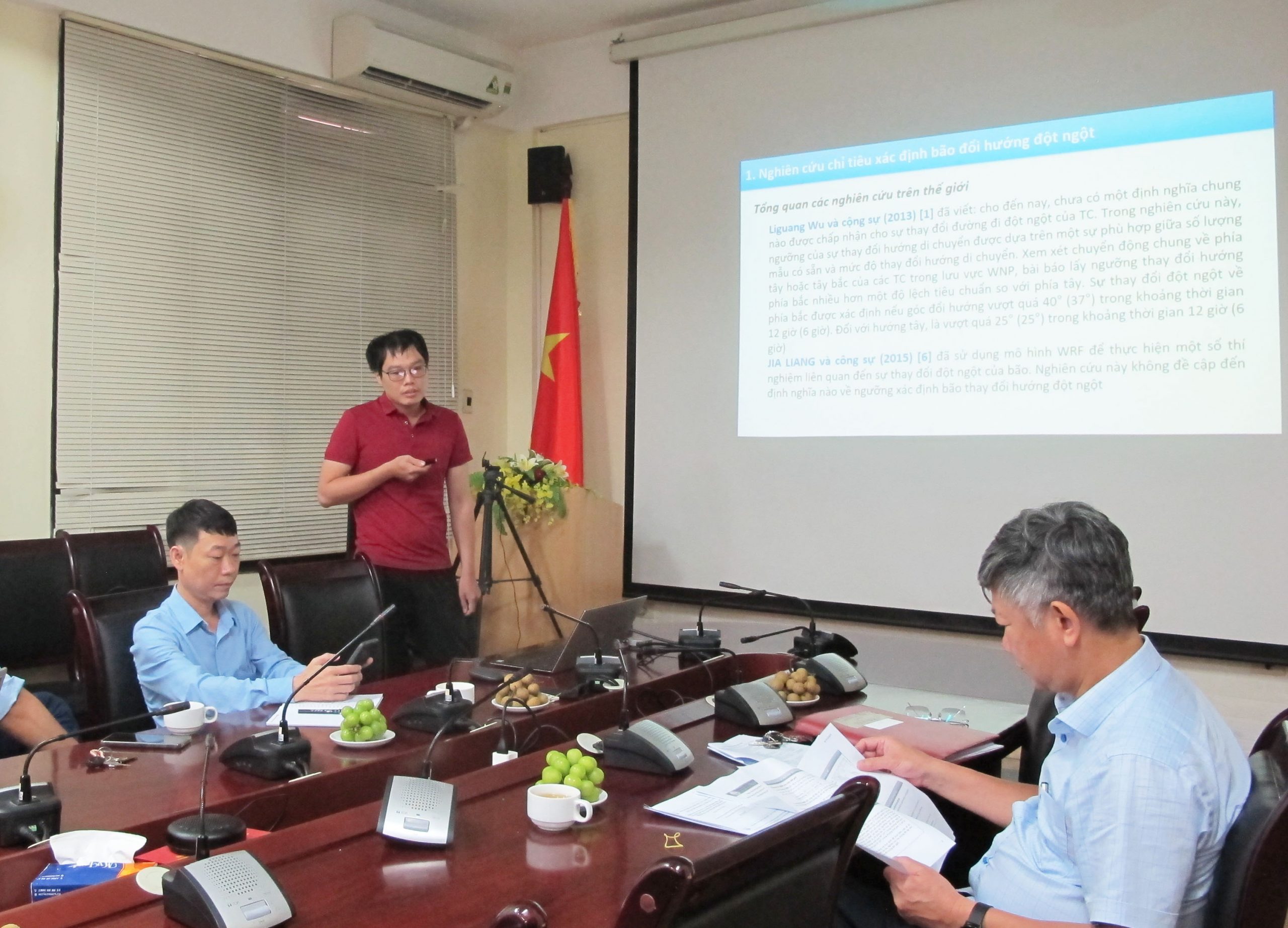 Từ mục tiêu trên, nhóm thực hiện triển khai các nội dung nghiên cứu khác nhau. Trong khuôn khổ hội thảo, Th.S. Trần Duy Thức đã trình bày báo cáo về nghiên cứu chỉ tiêu xác định sự thay đổi quỹ đạo đột ngột của bão trên khu vực Biển Đông. Báo cáo đã đưa ra kết quả nghiên cứu chỉ tiêu xác định bão đổi hướng đột ngột, kết quả lựa chọn các cơn bão đổi hướng đột ngột, đặc điểm của các cơn bão thay đổi hướng đột ngột và đề xuất hướng nghiên cứu tiếp theo..