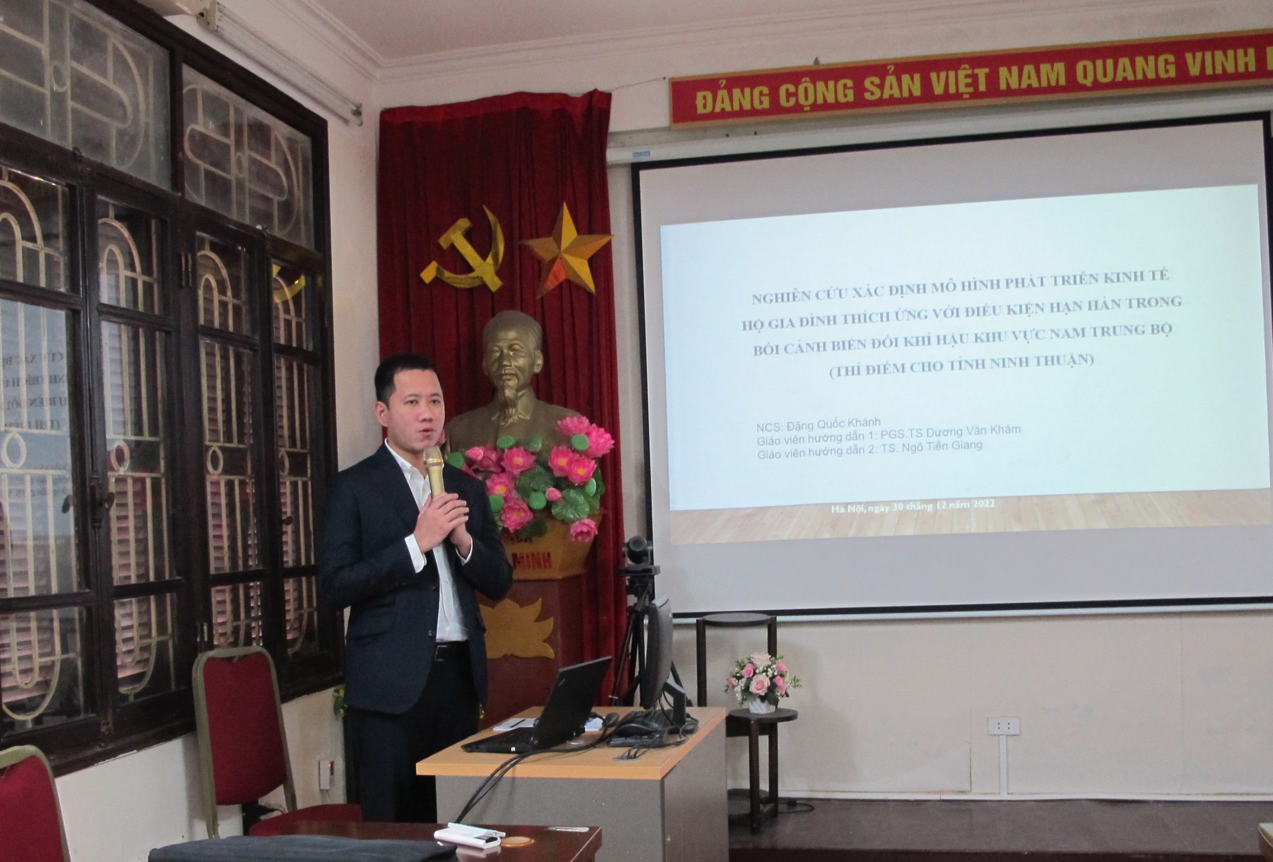 Tại Hội thảo, NCS. Đặng Quốc Khánh đã trình bày các nội dung của luận án. Trong đó, mục tiêu hướng đến của luận án là đánh giá được tình hình biến đổi khí hậu, đặc biệt là hạn hán tại tỉnh Ninh Thuận trong vòng 15 năm trở lại đây (2005-2020). Xây dựng được mô hình đánh giá các yếu tố ảnh hưởng hành vi thích ứng với hạn hán theo mùa của hộ nông dân tại tỉnh Ninh Thuận.
