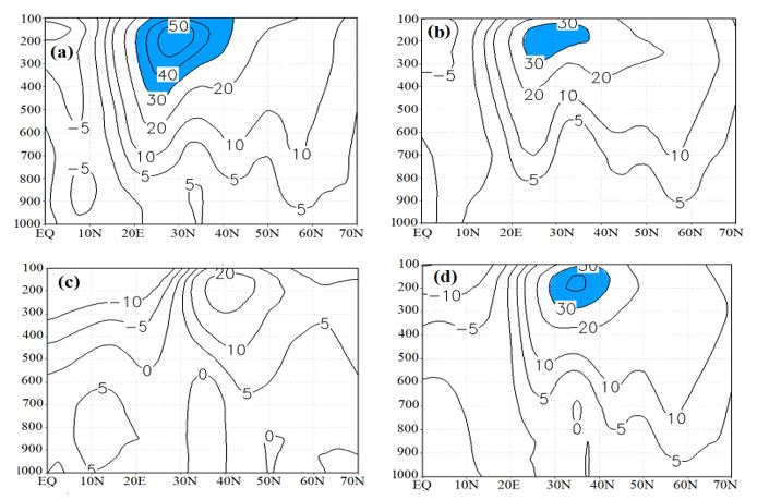 Mặt cắt vĩ hướng kinh độ 1000E của gió vĩ hướng theo mực độ cao trong tháng 1 (a), tháng 4 (b), tháng 7 (c), và tháng 10 (d)