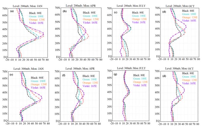 ) tại kinh độ 80oE (màu đen), 100oE (màu xanh), 120oE (màu đỏ) và 165oE (màu tím) mực 200 (a, b, c, d) và 300mb (e, f, g, h)