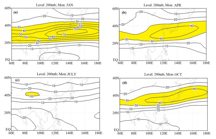 ) trên 30m/s trên mực 200mb trong tháng 1 (a), tháng 4 (b), tháng 7 (c) và tháng 10 (d)