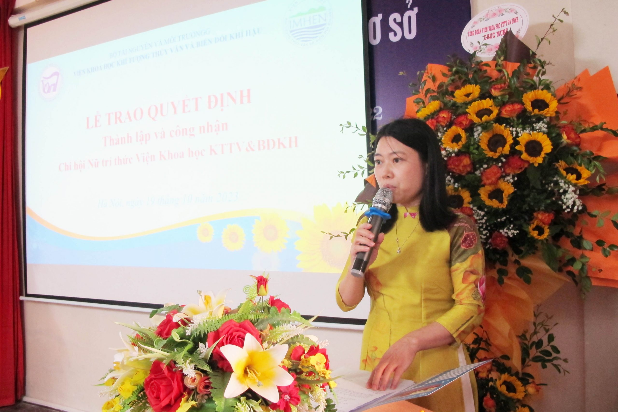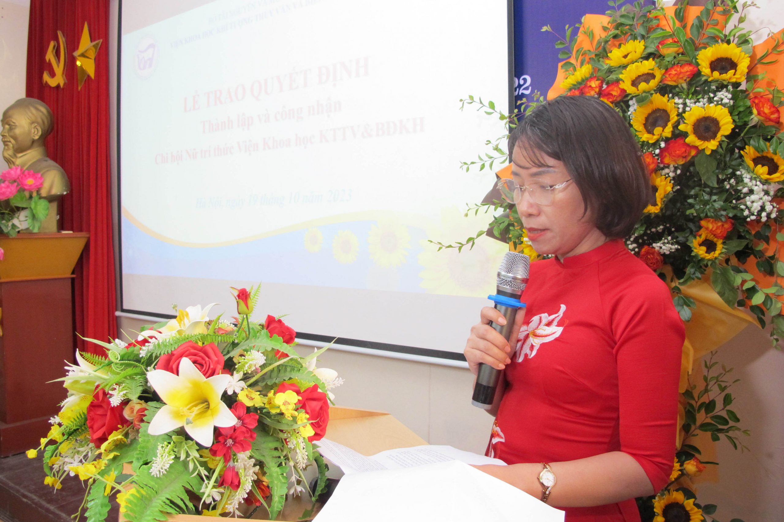 Mở đầu buổi lễ, bà Nguyễn Thị Dự đã công bố Quyết định thành lập Chi hội Nữ trí thức Viện KTTVBĐKH. Ngay sau đó, đại diện Chi hội Nữ trí thức Viện KTTVBĐKH, TS. Trần Thanh Thủy (Chi hội phó) thông qua Quyết định phân công Ban chấp hành chi hội Nữ trí thức Viện. TS. Tạ Thu Hằng (đại diện Chi Hội nữ trí thức Viện KTTVBĐKH) đã thông qua phương hướng hoạt động nhiệm kỳ 2023 – 2028 của Chi Hội.
