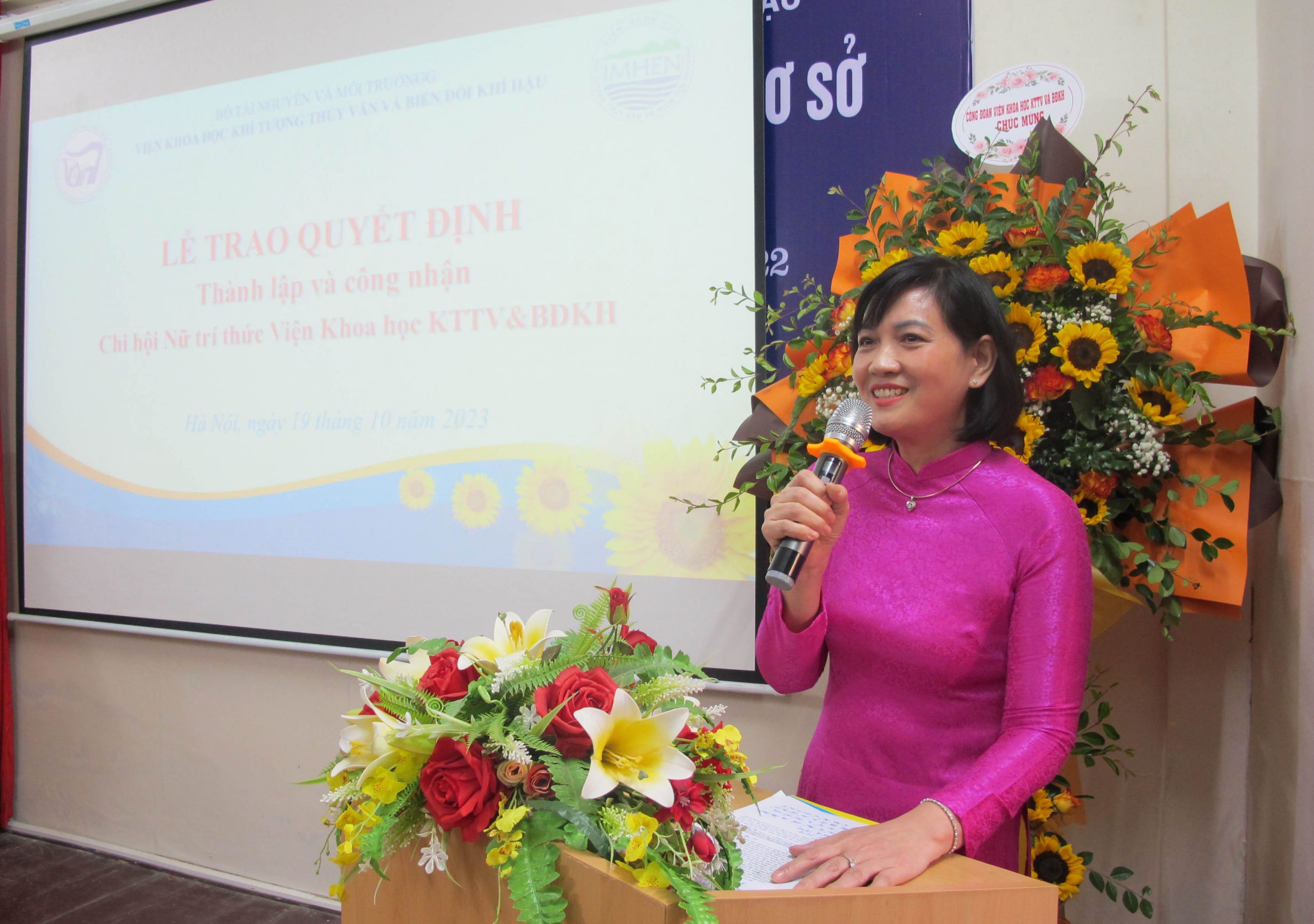 Phát biểu tại buổi lễ, GS.TS. Lê Thị Hợp (Chủ tịch Hội Nữ trí thức Việt Nam) đã chúc mừng Chi hội Nữ trí thức Viện KTTVBĐKH trở thành Chi hội thứ 33 trực thuộc Hội Nữ trí thức Việt Nam. Với sức mạnh là một Viện nghiên cứu có hơn 200 cán bộ, trong đó nữ chiếm đa số, GS.TS. Lê Thị Hợp kỳ vọng trong nhiệm kỳ, số hội viên của Chi hội sẽ ngày một tăng lên. Cũng theo GS.TS. Lê Thị Hợp, Ban Chấp hành chi hội Nữ trí thức Viện KTTVBĐKH với 5 thành viên thuộc các Phòng, trung tâm của Viện sẽ đoàn kết, năng động để chỉ đạo, động viên hội viên trong Chi hội thực hiện tốt các chỉ tiêu, phương hướng đã đề ra.