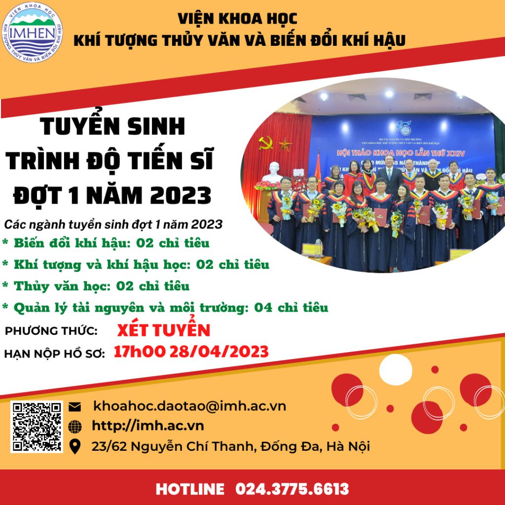 Đợt 1 Năm 2023, Viện Khoa học Khí tượng Thủy văn và Biến đổi khí hậu tuyển sinh vào 04 ngành là: Biến đổi khí hậu, Khí tượng và khí hậu học, Thủy văn học và Quản lý tài nguyên và môi trường.