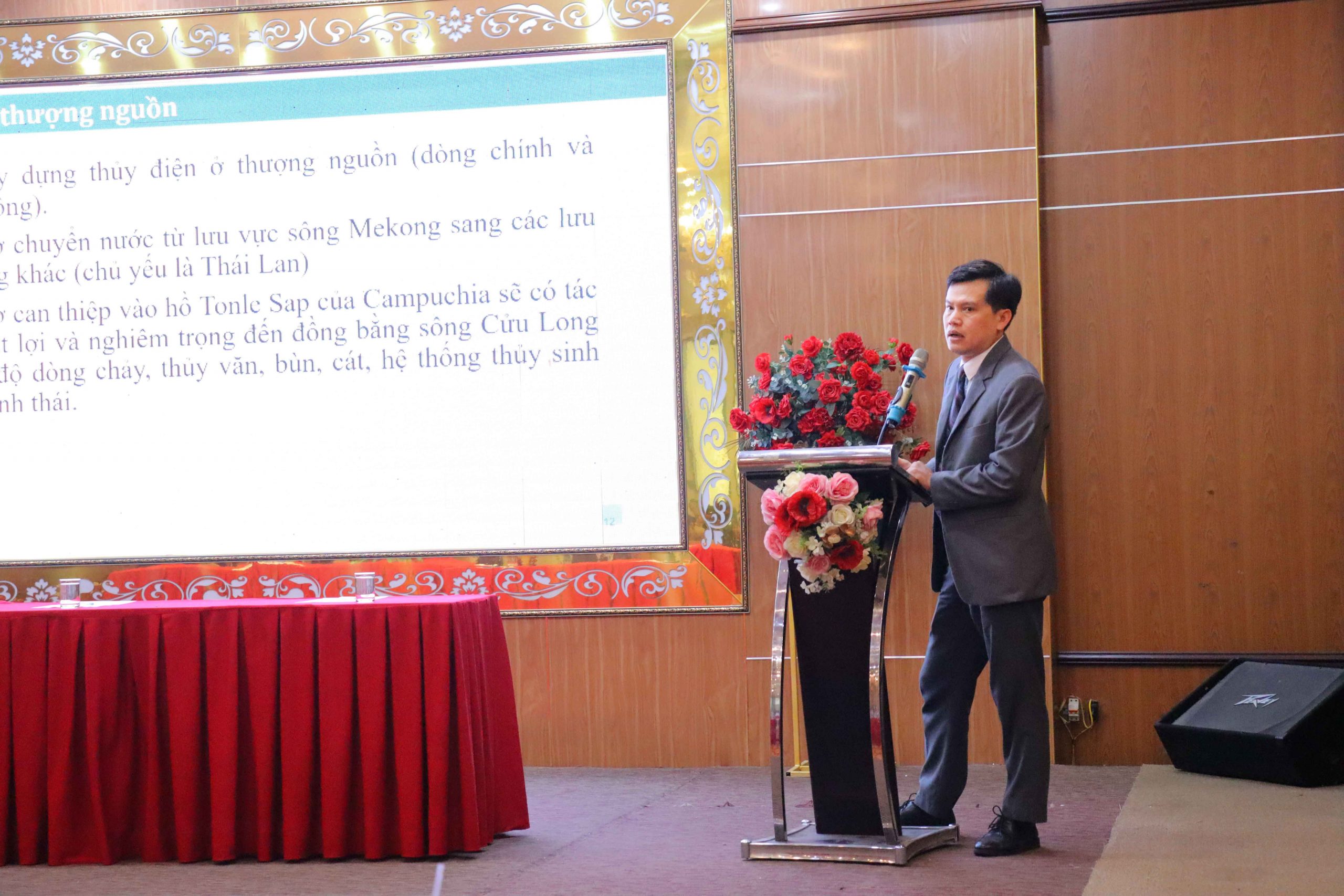 Báo cáo “Hiện trạng và các thách thức an ninh nguồn nước vùng hạ lưu Sông Cửu Long” của TS. Nguyễn Văn Hồng (Phân Viện Khoa học Khí tượng Thủy văn và Biến đổi khí hậu) đã tổng quan về nguồn nước mặt, nước dưới đất của vùng Đồng bằng Sông Cửu Long (ĐBSCL). Báo cáo đi sâu phân tích hiện trạng và các thách thức an ninh nguồn nước vùng hạ lưu Sông Cửu Long trong điều kiện biến đổi khí hậu, kịch bản nước biển dâng, phát triển thượng nguồn, phát triển kinh tế – xã hội nội vùng. Đồng thời, đưa ra các đề xuất cho vùng ĐBSCL như: Chuyển đổi mô hình cây trồng, chuyển đổi mục đích sử dụng đất và tăng cường năng lực thích ứng với biến đổi khí hậu; Hoàn thiện hệ thống đê điều ven biển (khép kín) và công trình kiểm soát; Chủ động kiểm soát độ mặn và tích trữ nước để ứng phó với hạn hán; Xây dựng bộ chỉ số an ninh nguồn nước đa mục tiêu và riêng biệt cho toàn vùng ĐBSCL và từng vùng để phục vụ nhu cầu khác nhau; Xây dựng và vận hành công tác quan trắc, cảnh báo tài nguyên nước hệ thống phục vụ vận hành hệ thống thủy lợi vùng ĐBSCL.